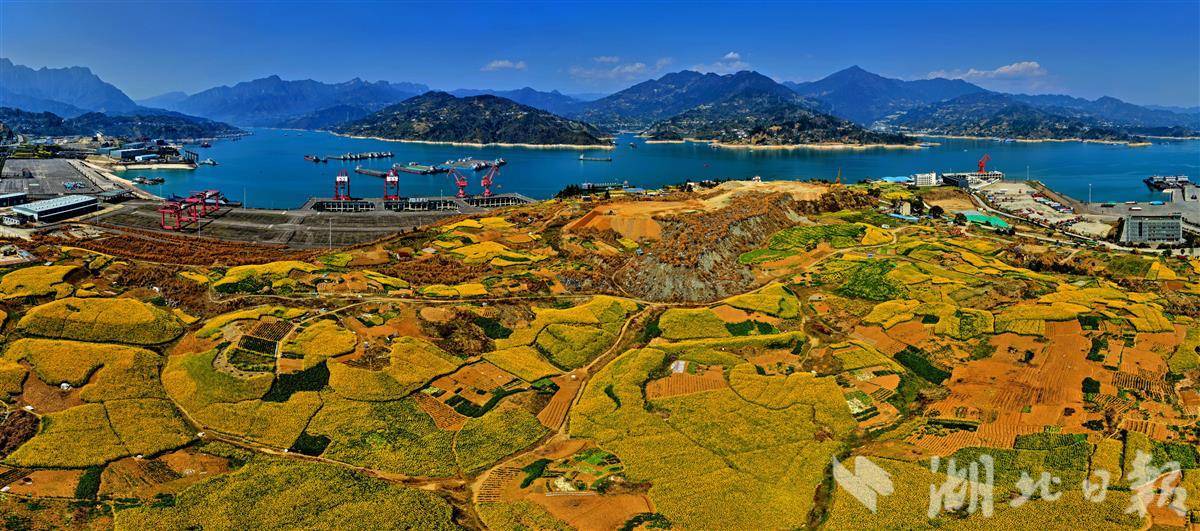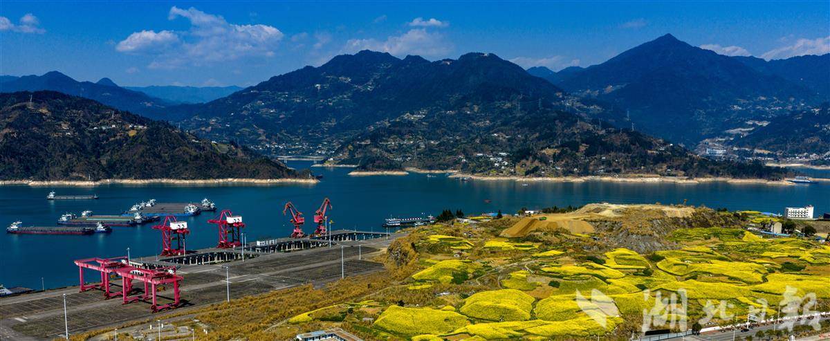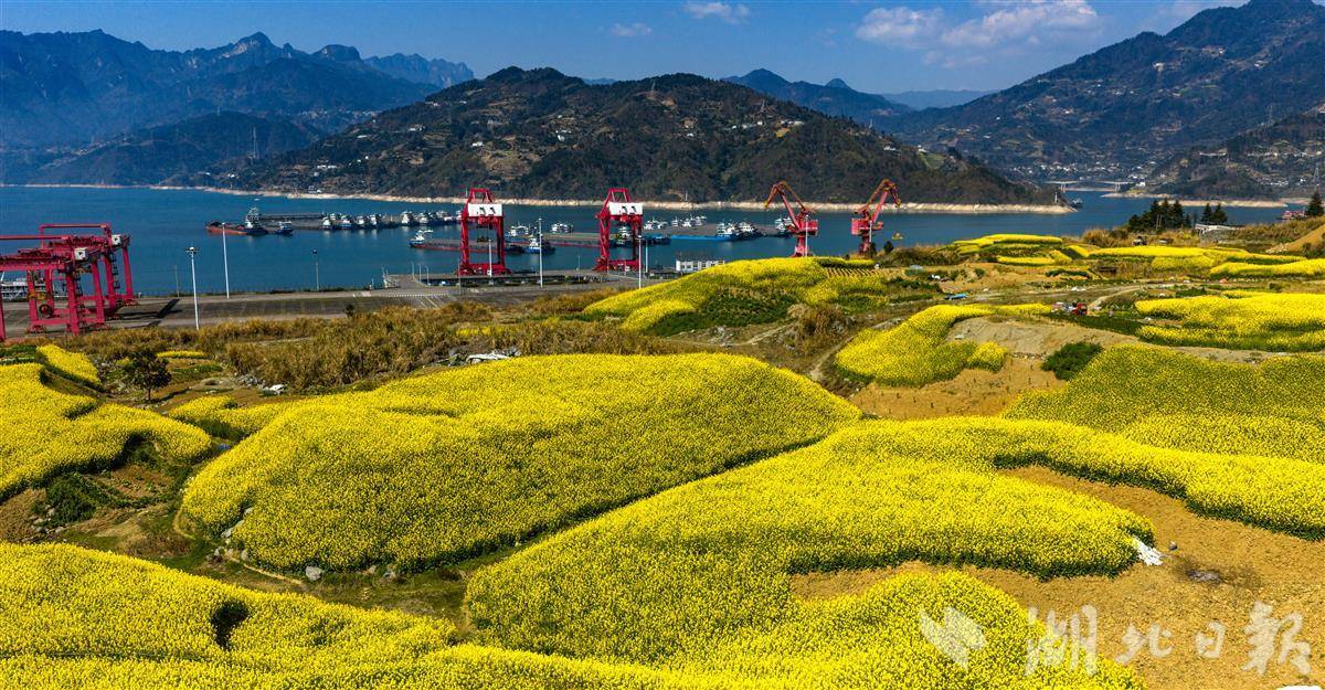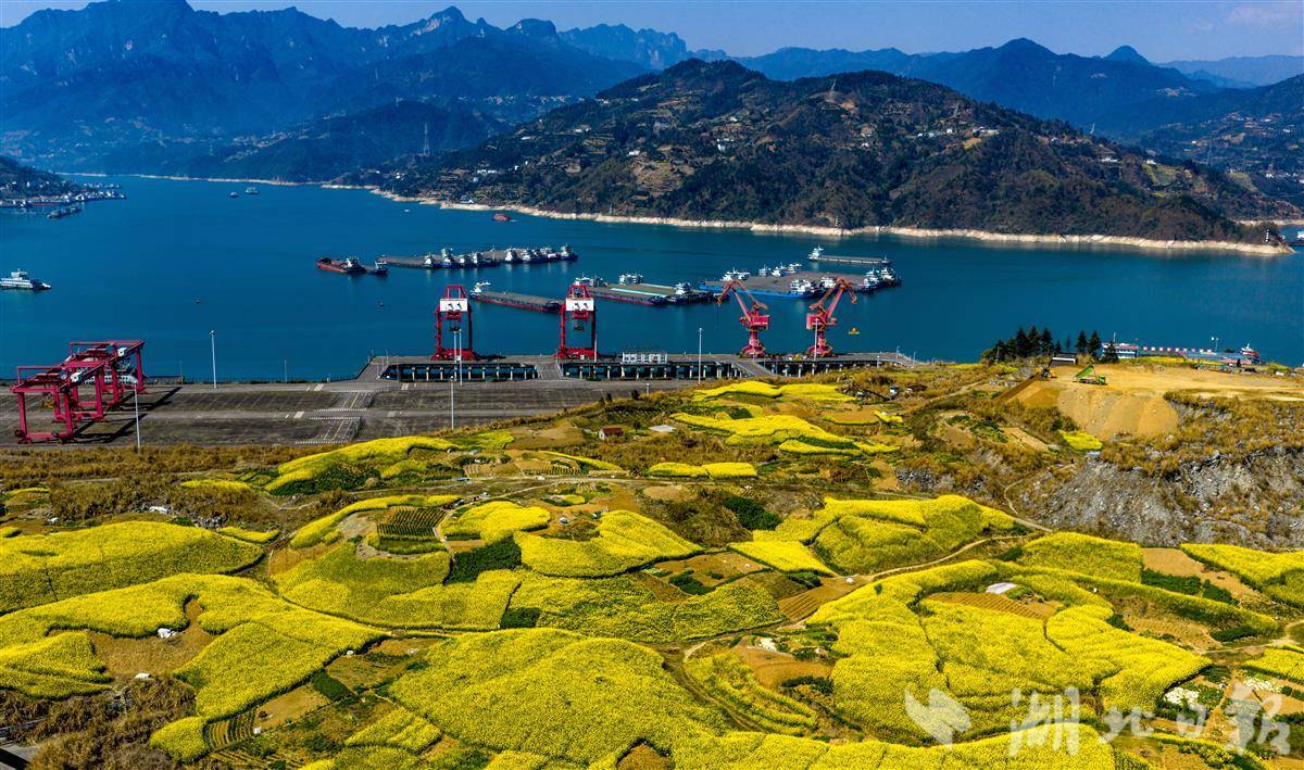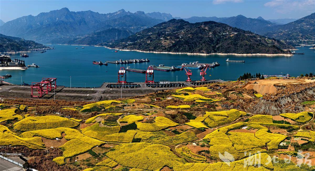 湖北秭归,长江岸边油菜花次第盛放,金色花海与码头红色岸桥、繁忙货轮相映成景。工业硬朗线条与田园柔美风光碰撞交融,春风拂过,花香与江风交织,绘就一幅春日峡江的绝美画卷。