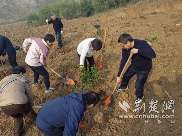 荆楚网(湖北日报网)讯(通讯员 钱坤)春潮涌动处,植树正当时。3月12日上午,在第46个植树节到来之际,荆门市东宝区人大代表泉口小组部分人大代表走进东宝区子陵铺镇八角村城北生态防护林片区,开展以“聚力支点建设•代表植绿践初心”为主题的义务植树活动。代表们挥锹培土、提水浇灌,亲手栽下一株株茶树苗,以实际行动践行“绿水青山就是金山银山”理念,为城市北部再添新绿。这也是荆门市人大代表泉口小组连续第四年深耕城北生态防护林建设。
