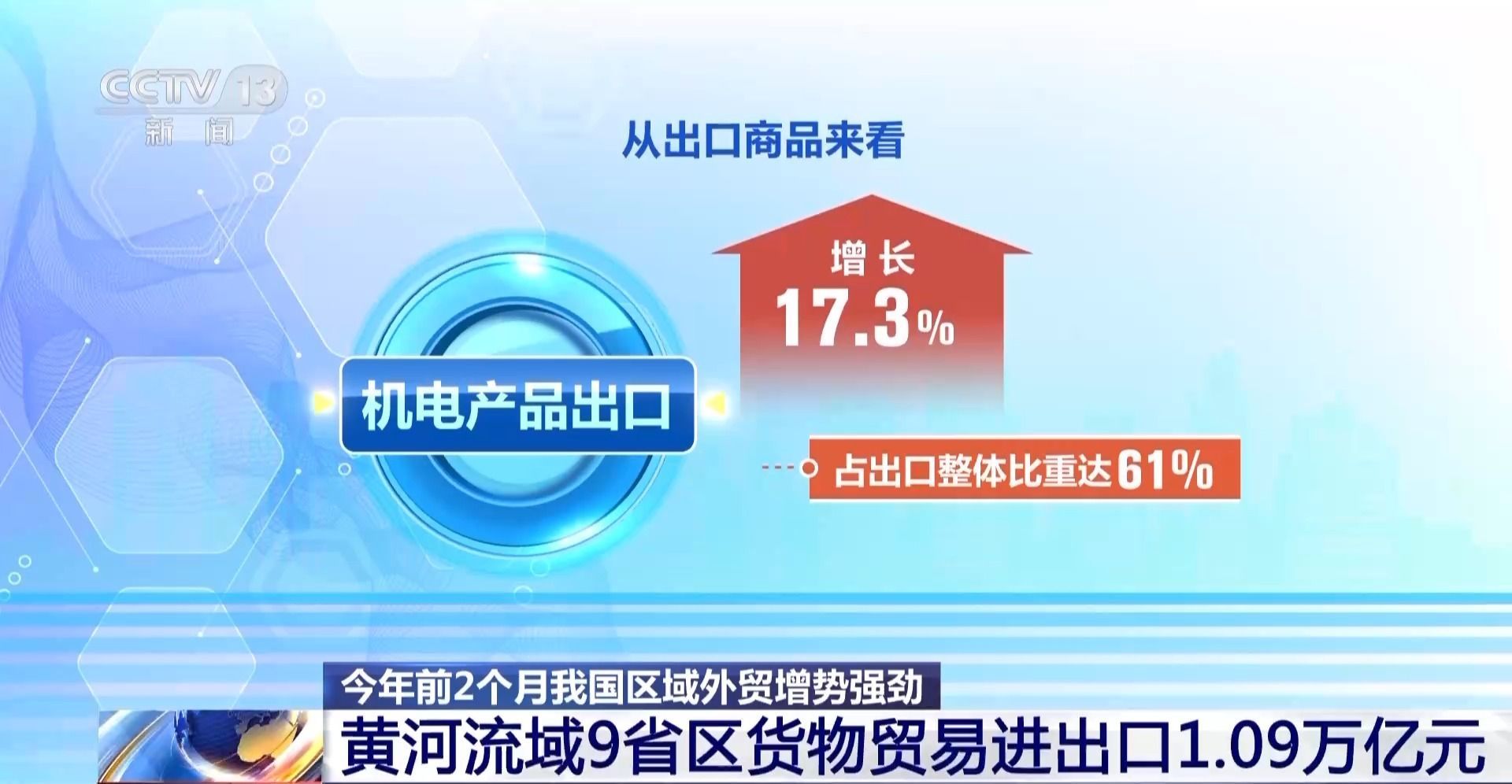 从出口商品来看,“新三样”、高新技术产品和农产品出口增长显著,特别是机电产品出口增长17.3%,占出口整体比重达61%。