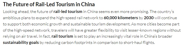 文章说,根据规划,到2030年,中国铁路营业里程将达到18万公里左右,其中高铁里程约6万公里,这将继续支持中国的经济增长和可持续旅游发展。