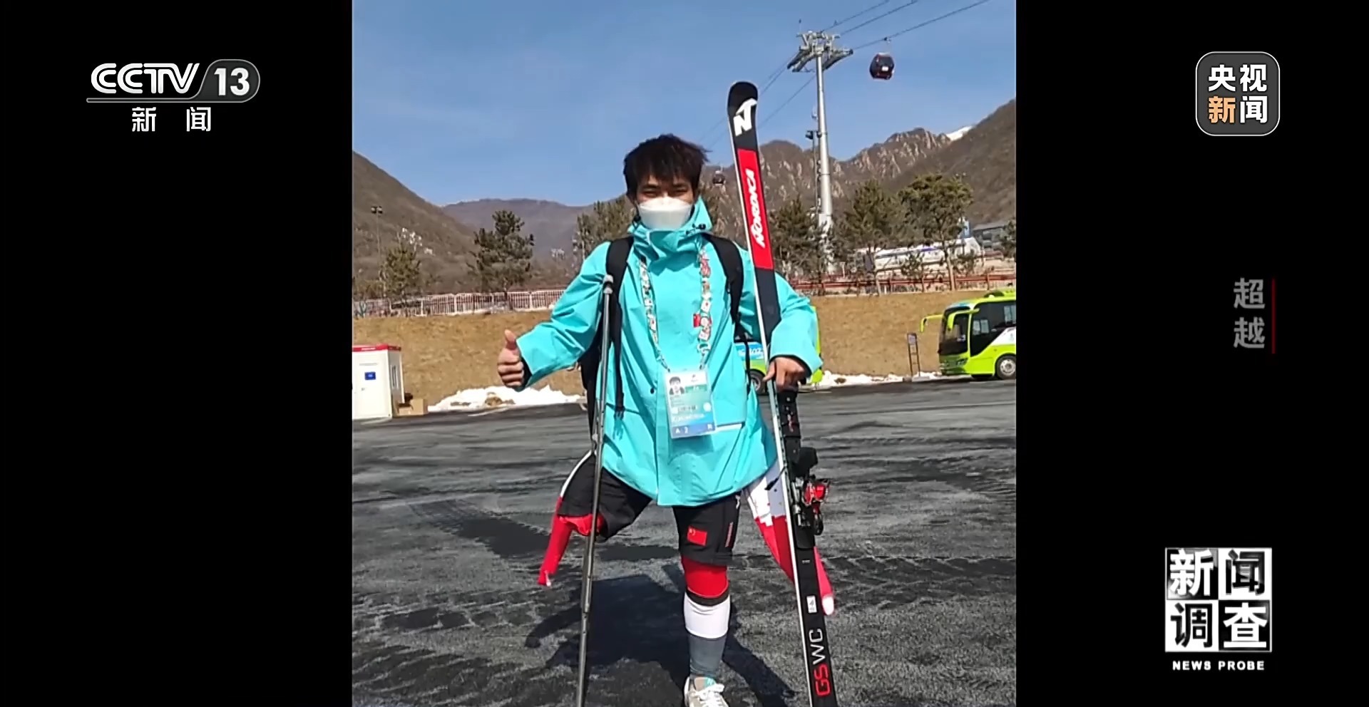 国家残奥高山滑雪队教练 王敬平:岩巩选择了站姿,一条腿滑,这是最难走的一条路。他腿的伤应该是蛮多的。