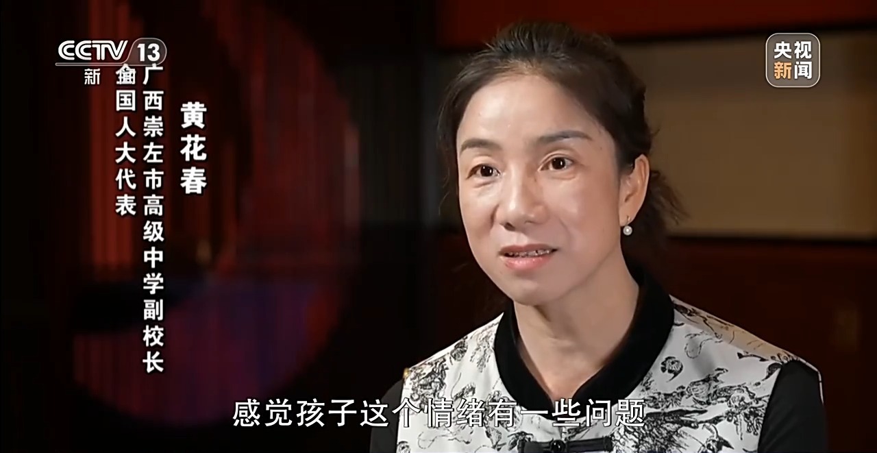 全国人大代表、广西崇左市高级中学副校长 黄花春:刚开始觉得好难,跟家长说据我们的观察,感觉孩子的情绪有一些问题,然后建议家长带去精神专科医院,这样一说家长立马就跳起来了,就会说你们这就给我的孩子贴标签,我的孩子就是有精神病,我说不是精神病,有时候是情绪问题,有时候是心理。焦虑问题要去解决,现在学校层面解决不了了,所以我们需要找专业的医生帮我们解决。