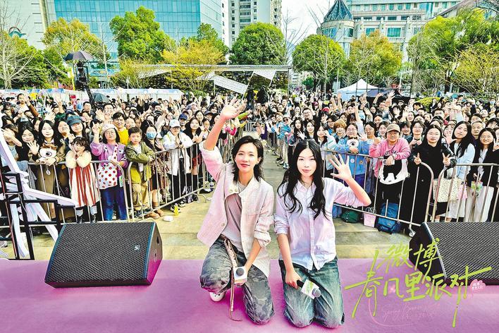 图②为3月14日,武汉西北湖广场举行“春风里派对”,脱口秀演员火锅(左)和王大刀表演结束后,与现场观众合影留念。(湖北日报通讯员 张靖悦 摄)