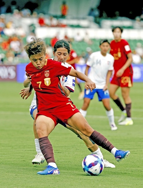 3月14日,中国队球员王霜(前)在比赛中拼抢 新华社发