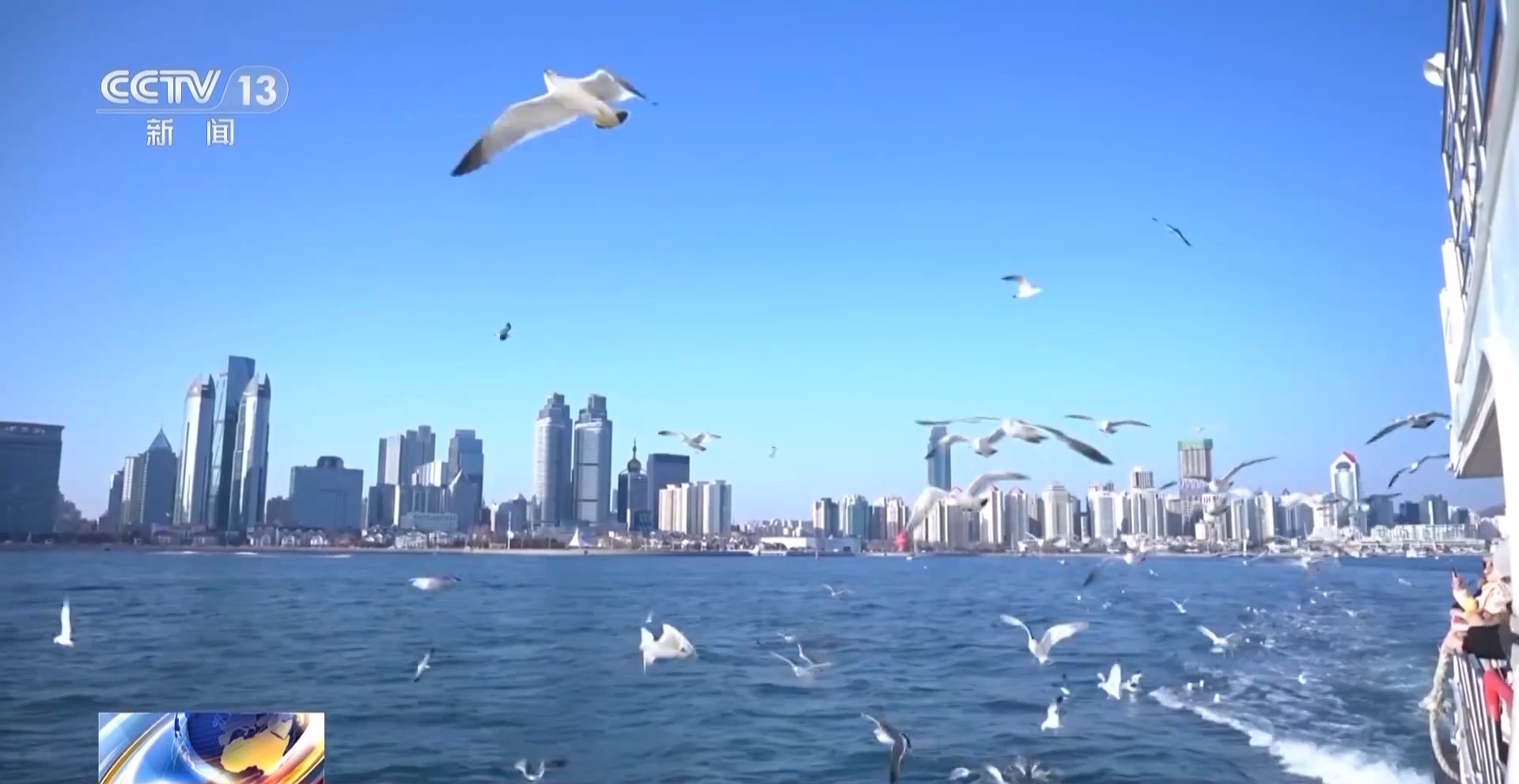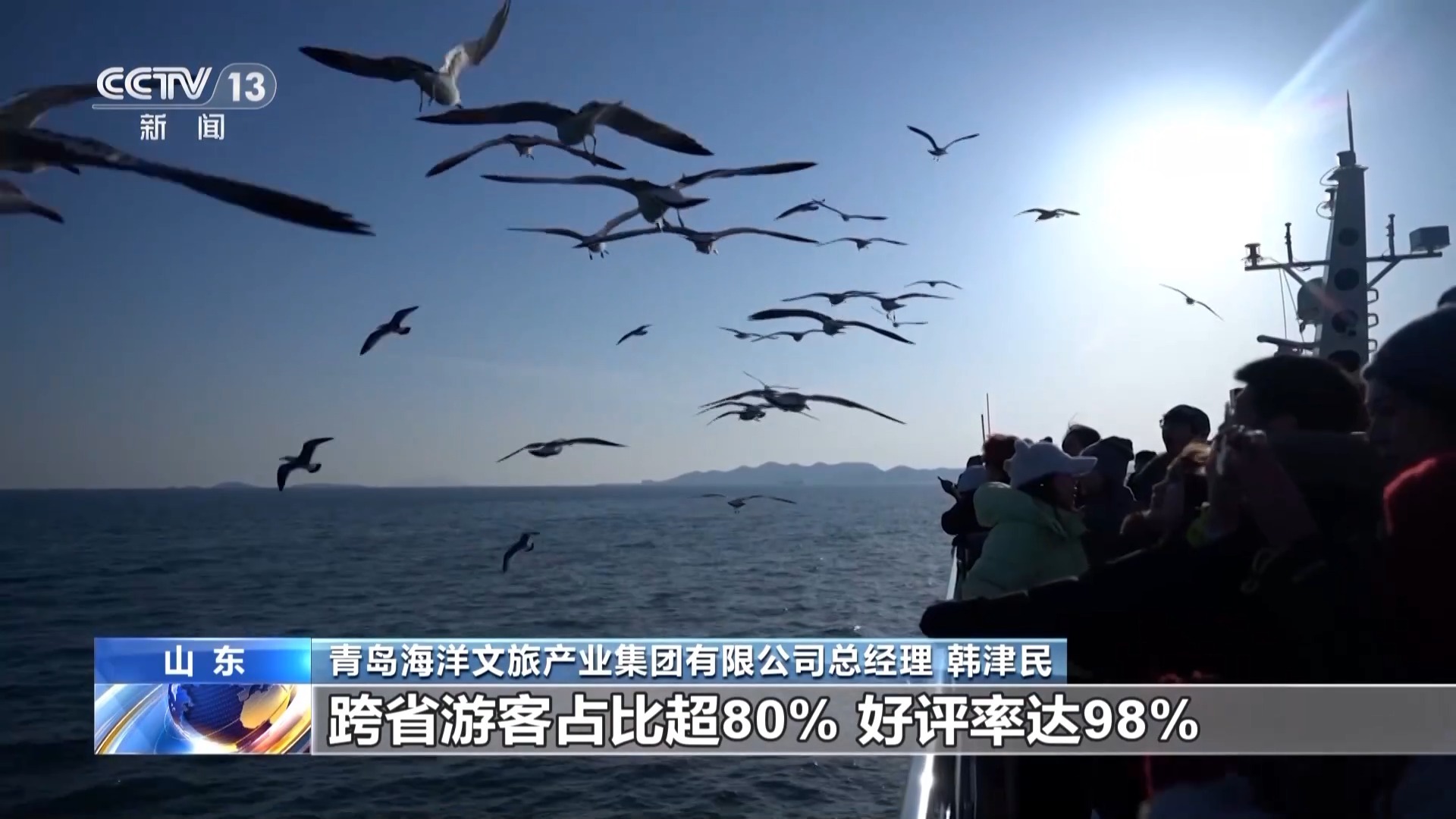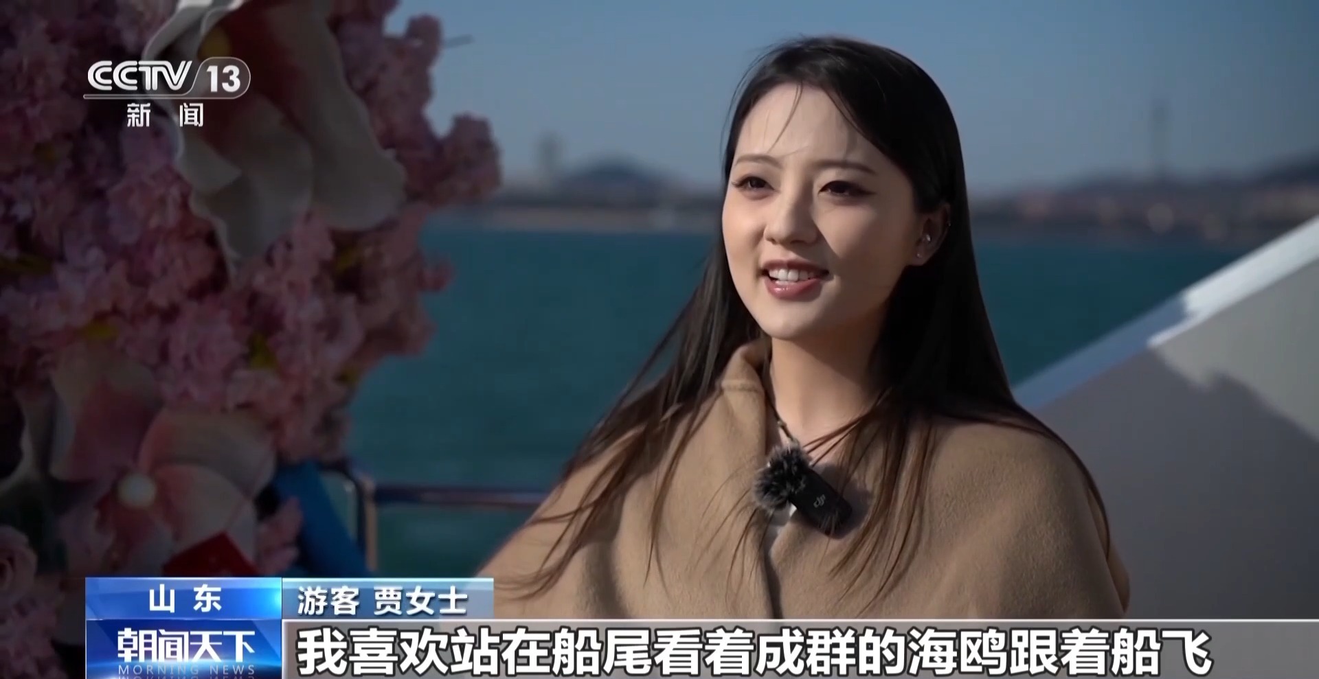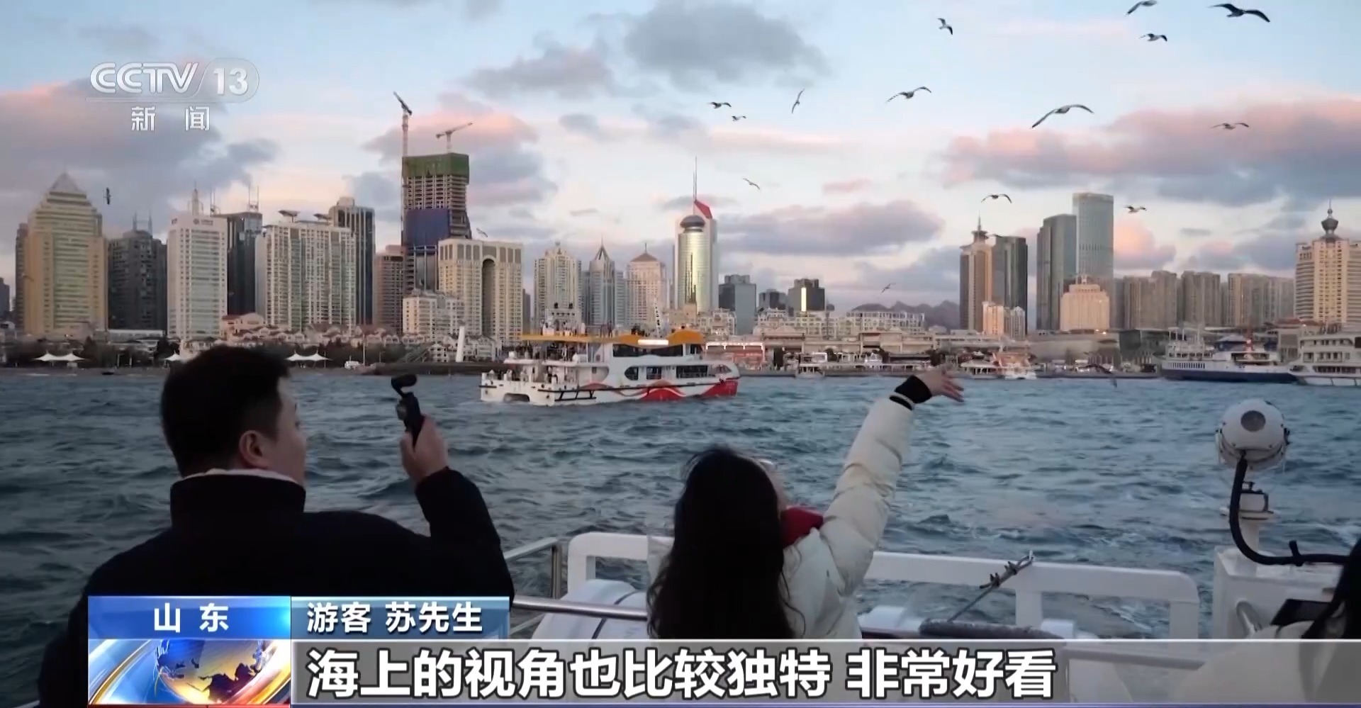 游客 贾女士:我喜欢站在船尾看着成群的海鸥跟着船飞,我一伸手就能跟它们互动,那种感觉特别奇妙。
