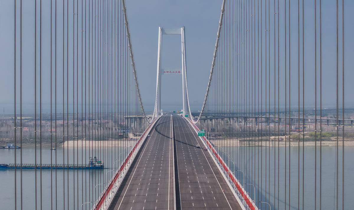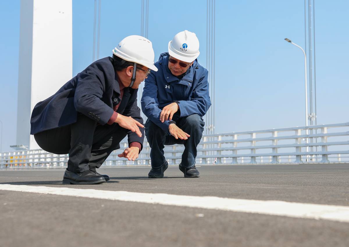 3月14日,武汉双柳长江大桥,大桥总设计师、中铁大桥勘测设计院副总工程师徐恭义,与湖北交投双柳桥公司党委书记、总经理汪西华一同前往桥面实地踏访。武汉双柳长江大桥是湖北省第40座、武汉市第12座长江大桥,也是全球首座智慧悬索桥,为武汉都市圈环线高速公路关键节点工程,即将于3月20日正式通车。通车后武汉新洲至鄂州华容通行时间将缩短至5分钟,串联“中国光谷”与“中国星谷”两大创新高地。徐恭义与汪西华在桥面上漫步,时而触摸桥面,时而拍照记录,实地查看大桥通车前的各项状态。(湖北日报全媒记者 柯皓 张灿 通讯员 杨鑫 摄)