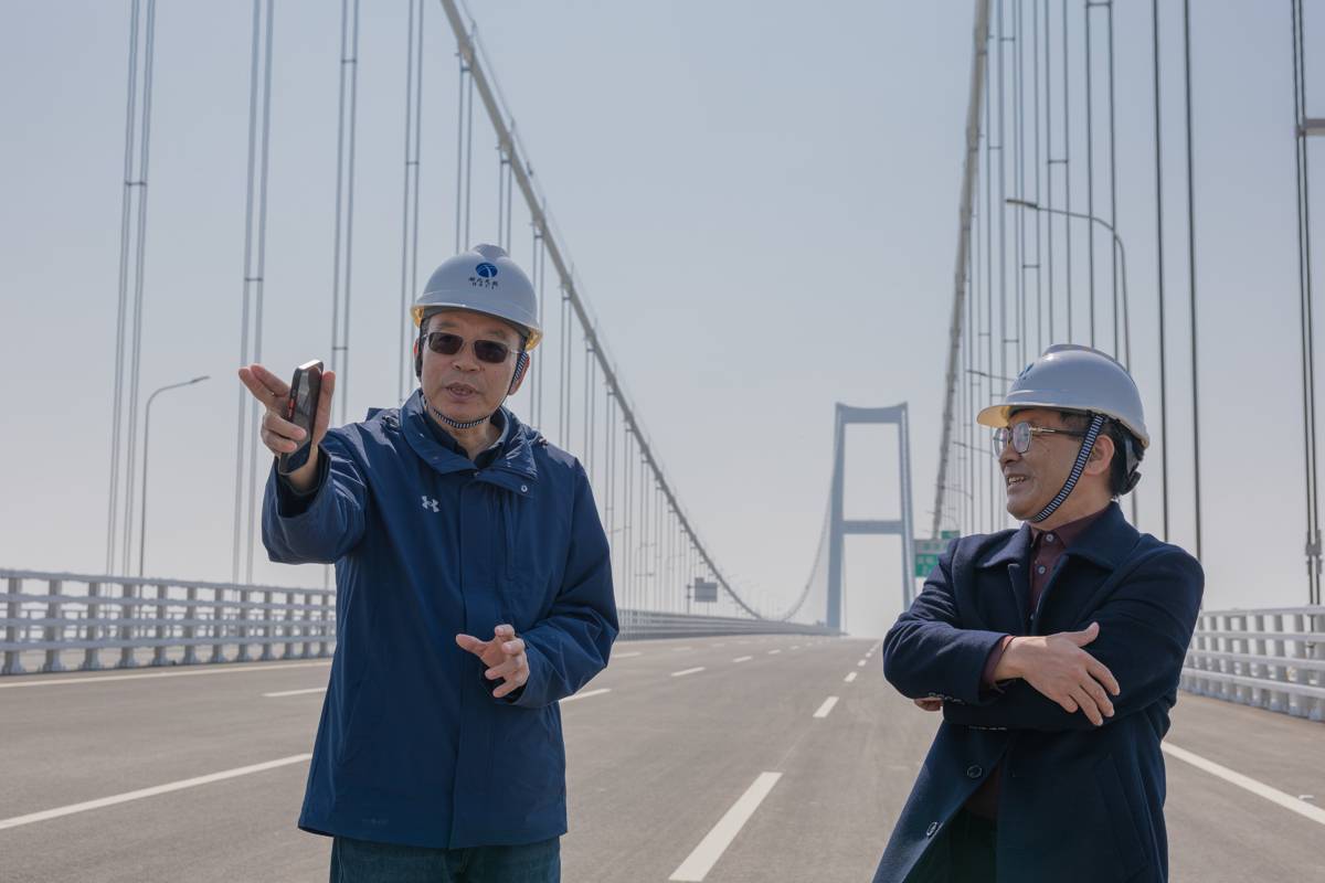 3月14日,大桥总设计师徐恭义(右)和汪西华在查看桥面。(湖北日报全媒记者 柯皓 摄)