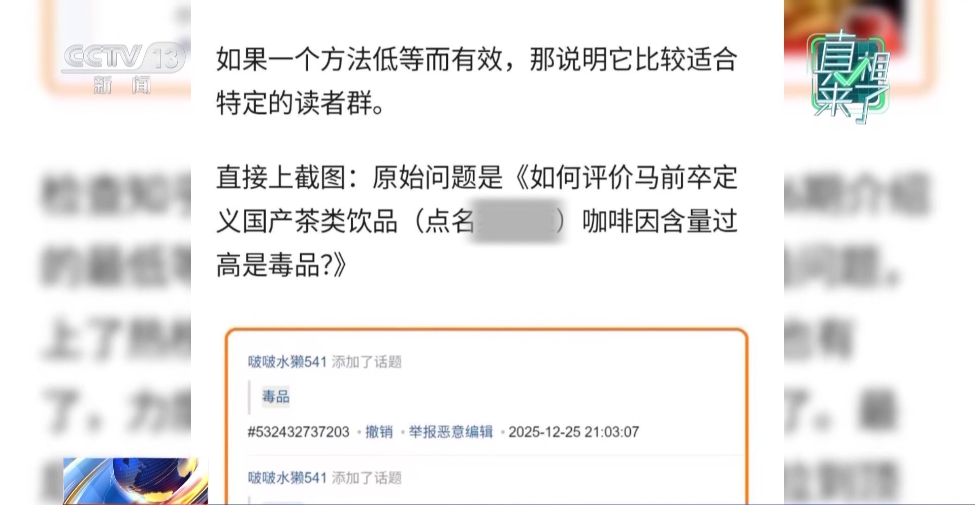 2025年12月下旬,知乎平台上出现一则关于“伪中产阶级”的话题讨论,在交流中,网名为“睡前消息”的任某突然抛出极具误导性的言论,将某茶饮企业的奶茶与“准毒品”关联,声称“诸如某茶饮企业等高浓度咖啡因饮料,实际上在蹭准毒品的擦边球,只是他们嘴上坚决不承认”。