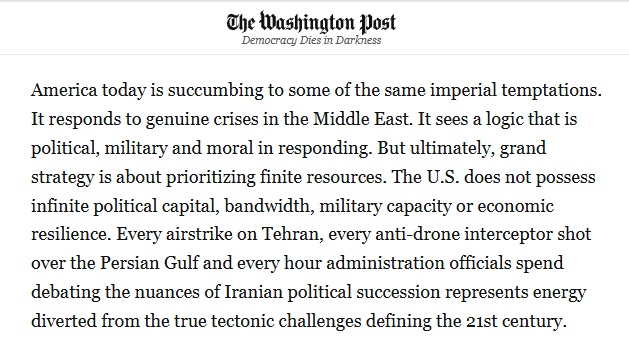 文章最后说,即便对伊朗的干预取得成功,美国也将不得不被捆绑于该国的命运走向。但这难道真是未来十年美国最值得倾注时间与精力的方向吗?从英国的兴衰中得出的教训清晰可见:超级大国的陨落,通常并非源于外敌的征服,而是因为自身在边缘地带过度扩张,却忽视了核心所在。