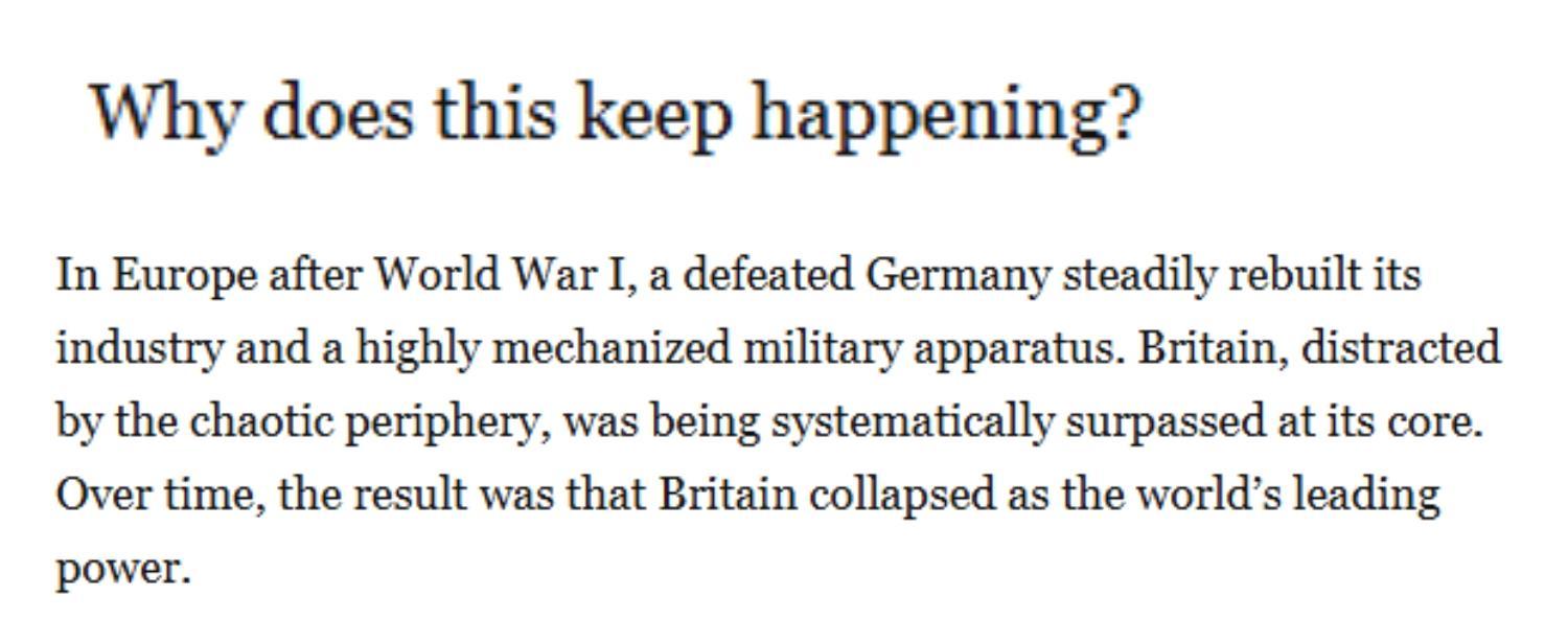 为什么这种情况一再发生?文章认为,要了解当下,就必须回望历史。英国曾是世界唯一的超级大国。而当英国领导人就美索不达米亚的战略激烈辩论时,他们却从根本上忽视了自身面临的经济问题和技术挑战。就在英国与中东和非洲部落作战之际,大西洋彼岸的美国正在悄然打造当时全球最先进的工业经济体系;第一次世界大战后的欧洲,战败的德国稳步重建工业和高度机械化的军事体系。而因动荡的边缘地带分心的英国,其核心实力正被系统性超越。最终,英国失去了世界霸主的地位。