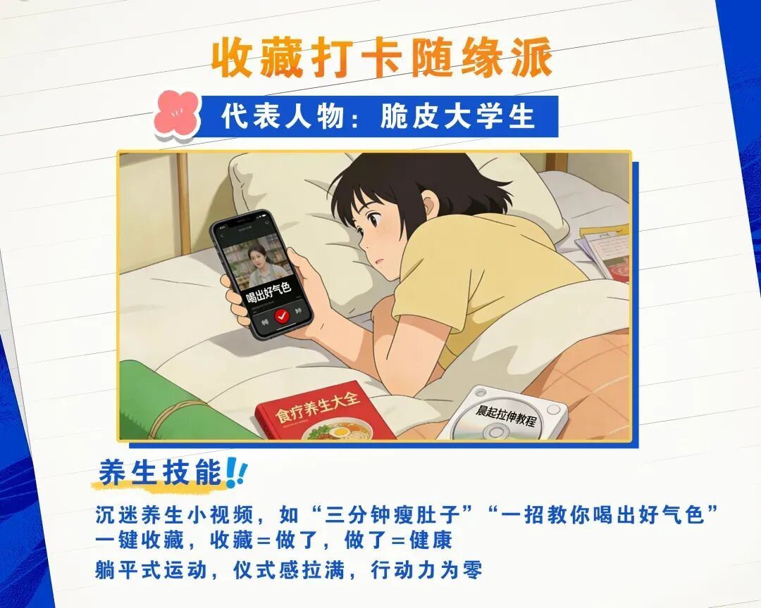 以年轻学生群体为主,手机收藏夹里塞满了“三分钟瘦肚子”“一招养出好气色”的养生短视频,仪式感拉满,行动力却为零。