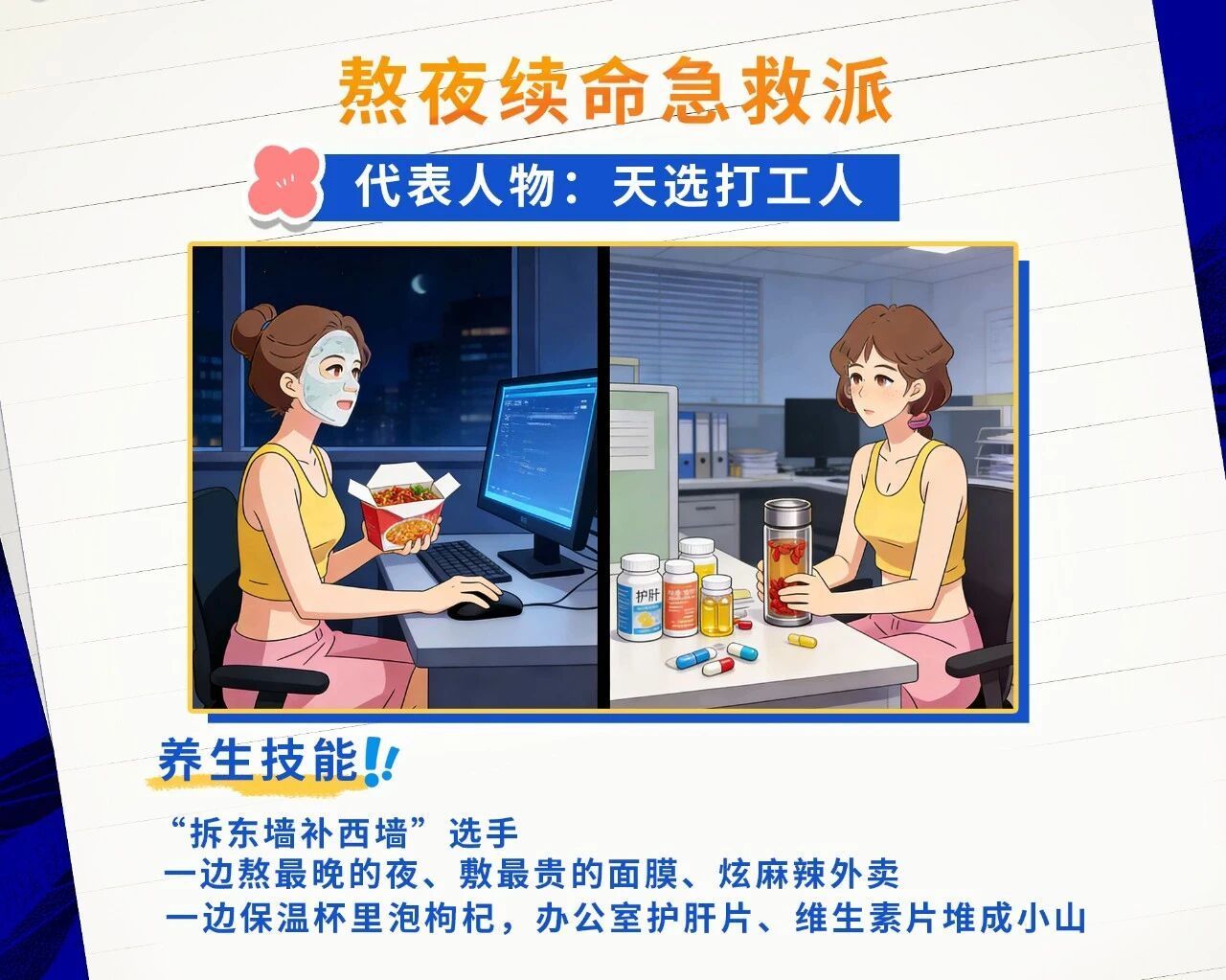 典型的“天选打工人”,奉行“拆东墙补西墙”的养生逻辑,白天透支身体熬夜加班、重油重辣饮食,晚上靠着枸杞水、护肝片、高价面膜强行补救。