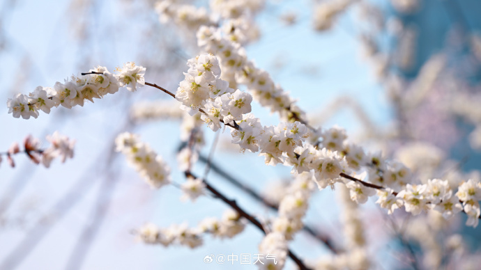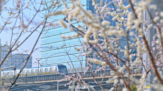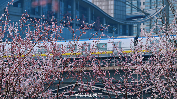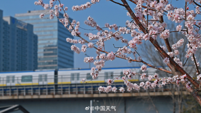 粉白的山桃花开满枝头,北京这趟开往繁花的轻轨正携春而来。网友:春日浪漫氛围溢出屏幕了↓↓