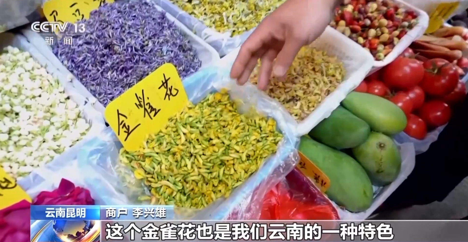商户 李兴雄:这个金雀花也是我们云南的一种特色,必须到春天才吃,可以用来煎鸡蛋、炒菜烧汤都可以。