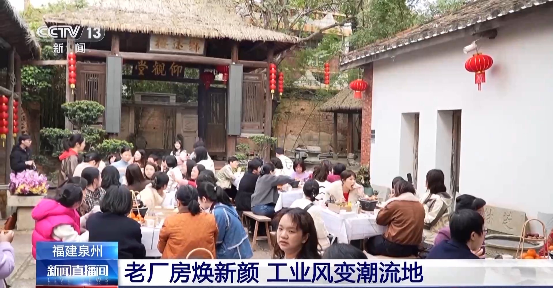 总台记者 阮思潼:在福建泉州源和1916创意产业园,随处都能感受到新旧时光交融带来的独特韵味。在这个产业园内,最引人瞩目的是一座高达二十多米的红砖大烟囱,它是旧蜜饯厂时期遗留下来的工业建筑,现在它的周围装点上了各式各样的创意装置。这里一些老工业厂房的墙面上,也画满了各种各样、不同颜色的卡通墙绘,也让这片斑驳的墙面焕发出了新的生机。