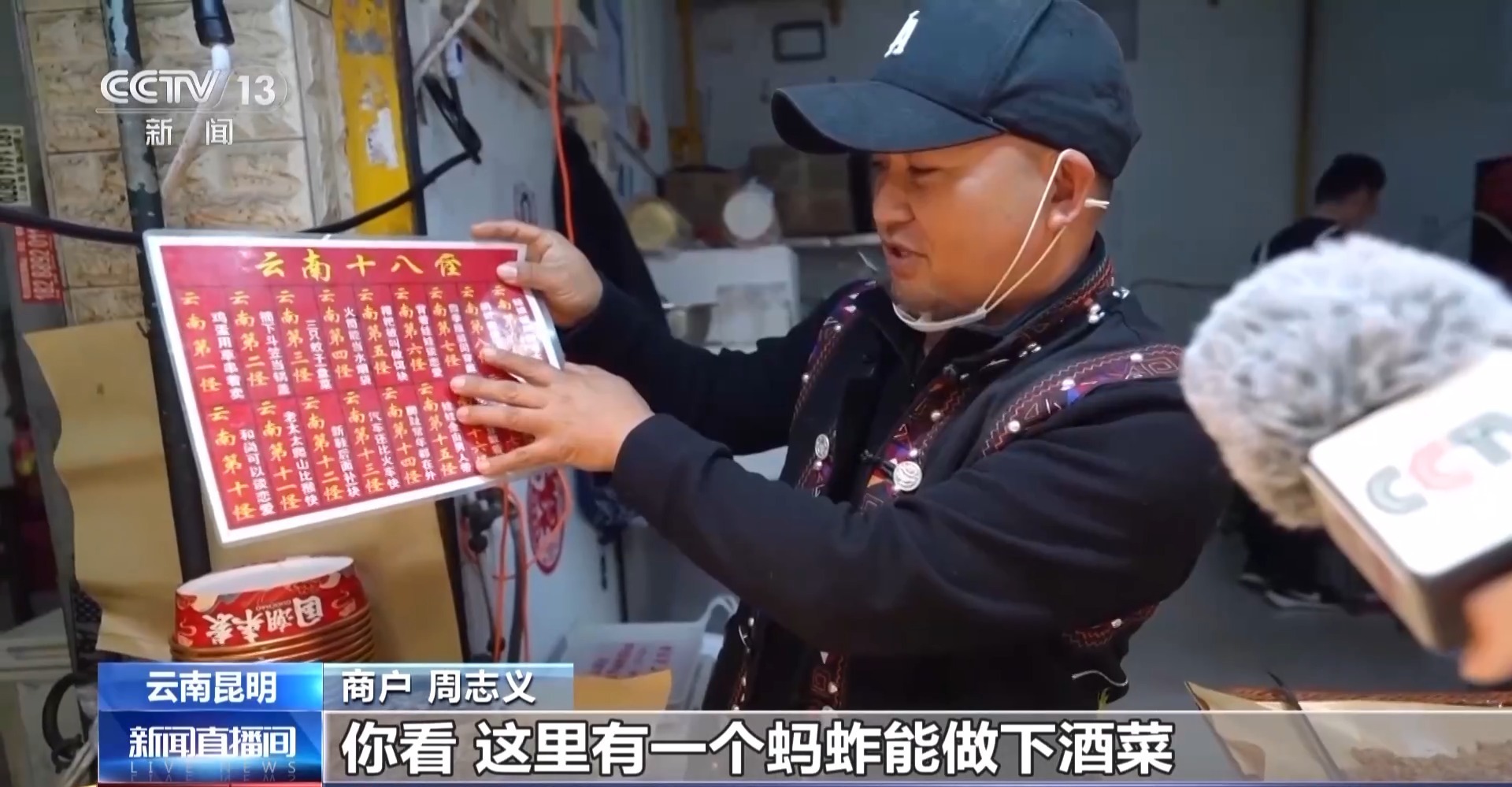 商户 周志义:你看,这里有一个蚂蚱能做下酒菜,就是“云南十八怪”的第八怪。