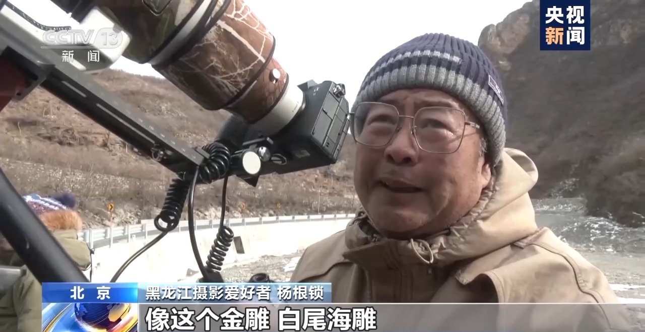 黑龙江摄影爱好者 杨根锁:像这个金雕、白尾海雕本来我们都认为是在东北地区像大小兴安岭这些地方深山老林里出现,在北京能够出现,确实让人意想不到。
