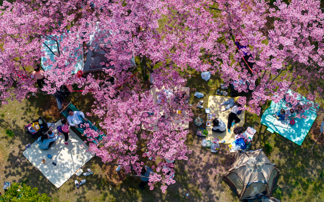 光谷地铁站,“樱花经济”带动市民露营(魏铼 | 摄)
