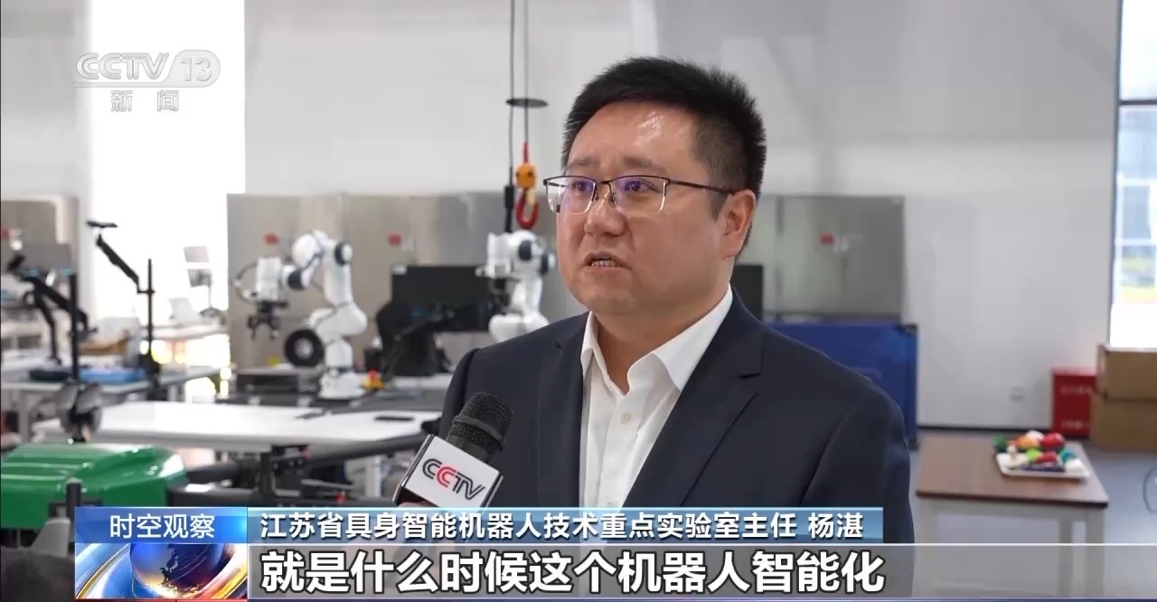 江苏省具身智能机器人技术重点实验室主任 杨湛:什么样标准的机器人我们讨论很多种。是加了手的手机、还是加了手的家电?什么时候机器人智能化,包括它的软件化水平像手机一样安全,同时机械结构以及设计符合国家标准,像家电一样安全才能进入家庭。