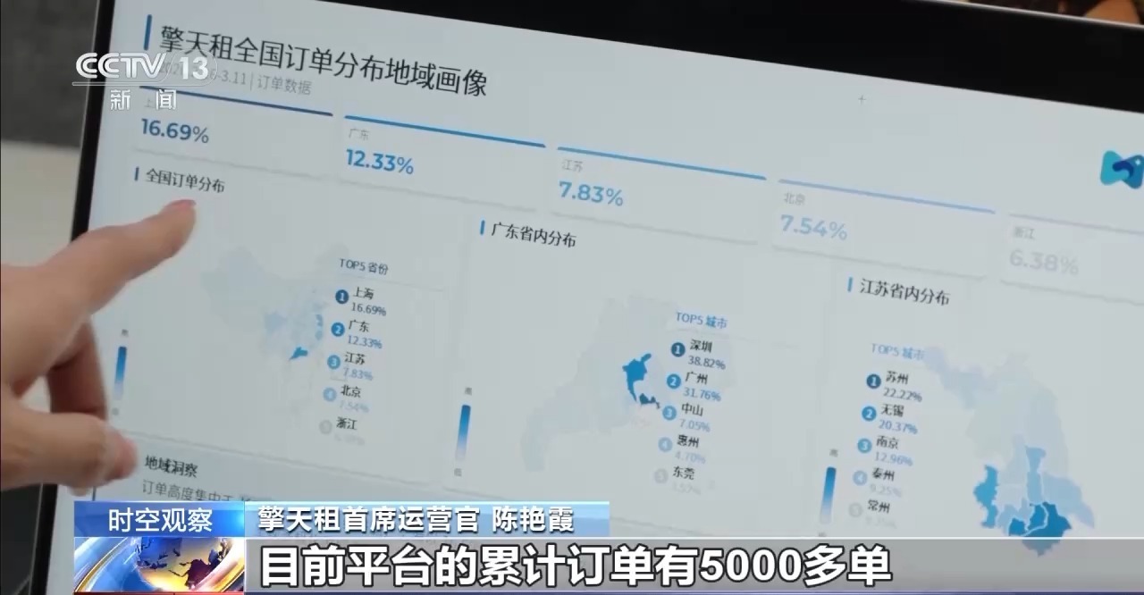 擎天租首席运营官 陈艳霞:订单大屏上能看到,我们的业务正在上海、广东、江苏、北京、浙江都在全面运转。目前平台的累计订单有5000多单。现在我们的整体的订单已经排到了五一(劳动)节以后。