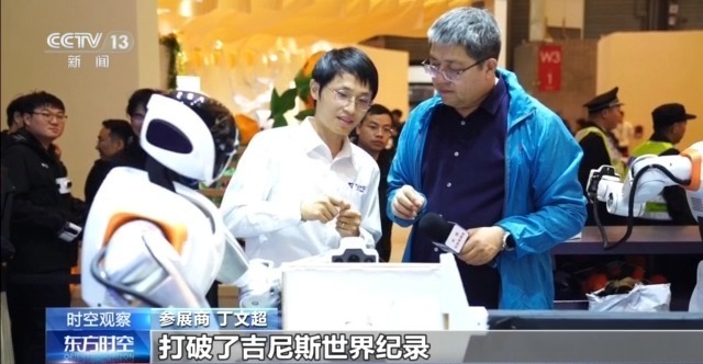 参展商 丁文超:在一小时内完成了105根线以上的精密装配,打破了吉尼斯世界纪录。背后逻辑是,我们(数据)采集的主体是人,不是像传统的去遥控机器人采集,通过一个大模型吸收了这些数据之后,可以灵活地把它迁移到机器人,让机器人也拥有这个能力。