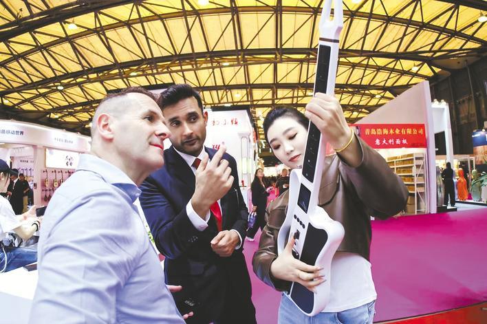 销售人员向外国客户介绍智能吉他K1。(受访者供图)