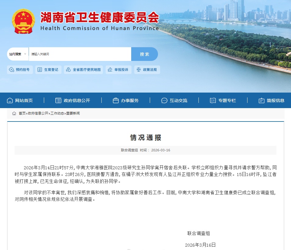 2026年3月14日21时57分,中南大学湘雅医院2023级研究生孙同学离开宿舍后失联。学校立即组织力量寻找并请求警方帮助,同时与学生家属保持联系。23时26分,医院接警方通告,在橘子洲大桥发现有人坠江并正组织专业力量全力搜救。15日16时许,坠江者被打捞上岸,已无生命体征,经确认,为失联的孙同学。
