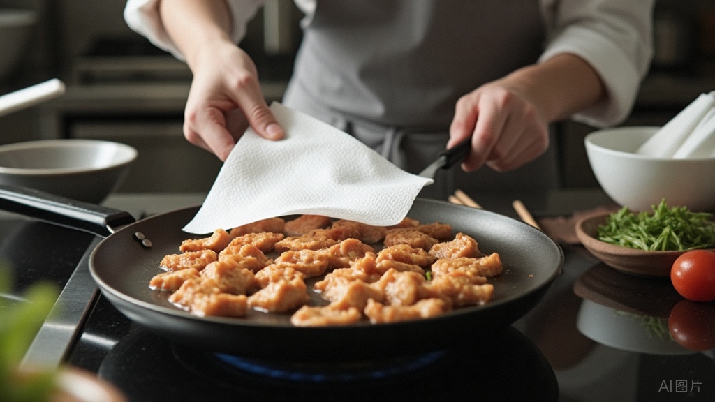 当食物温度超过60℃,厨房纸中的漂白剂、荧光剂等成分有可能加速析出,长期摄入这些物质可能影响人体代谢功能。使用厨房纸接触热食时,需待食物降温至微温(<50℃)再操作,且接触时间不超过2分钟。