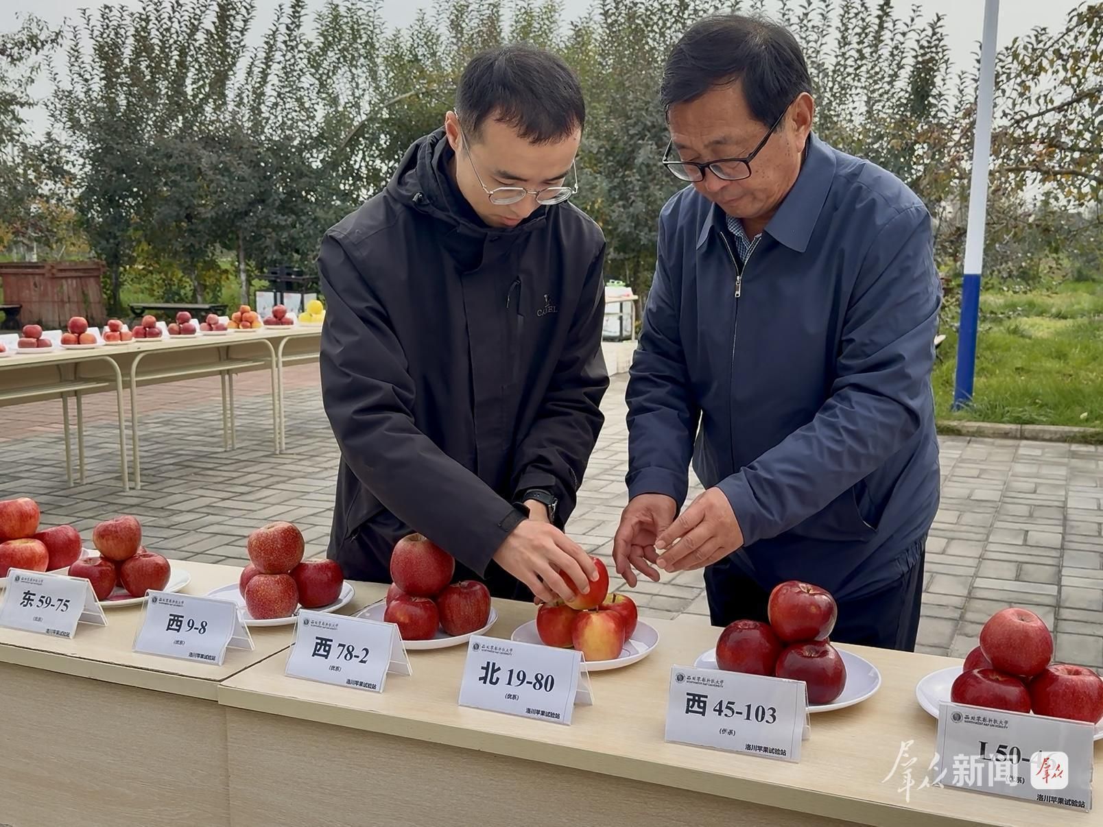 马锋旺(右)和张新杰(左)在检查苹果品鉴会上的样品。