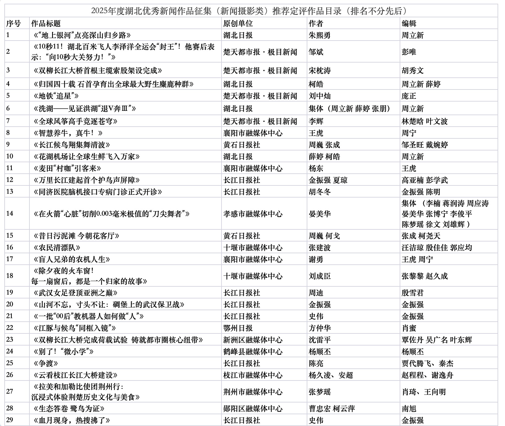 受湖北省新闻工作者协会(简称省记协)委托,湖北省新闻摄影学会组织专家学者及部分媒体负责人10名,对申报2025年度湖北优秀新闻作品征集(新闻摄影类)作品进行初评,确定29件作品参加2025年度湖北优秀新闻作品征集(新闻摄影类)定评。