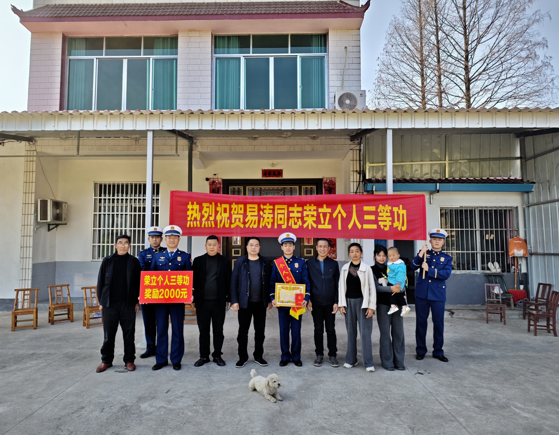 “送奖报喜团”一行拉着鲜红的横幅,捧着沉甸甸的荣誉证书,走进了立功同志易涛家中分享荣光。送奖团成员与功臣家属围坐在一起,亲切交谈,中队主管详细介绍了获奖指战员在队伍中的现实表现和成长进步,仔细询问了家属们的生活情况及实际困难。
