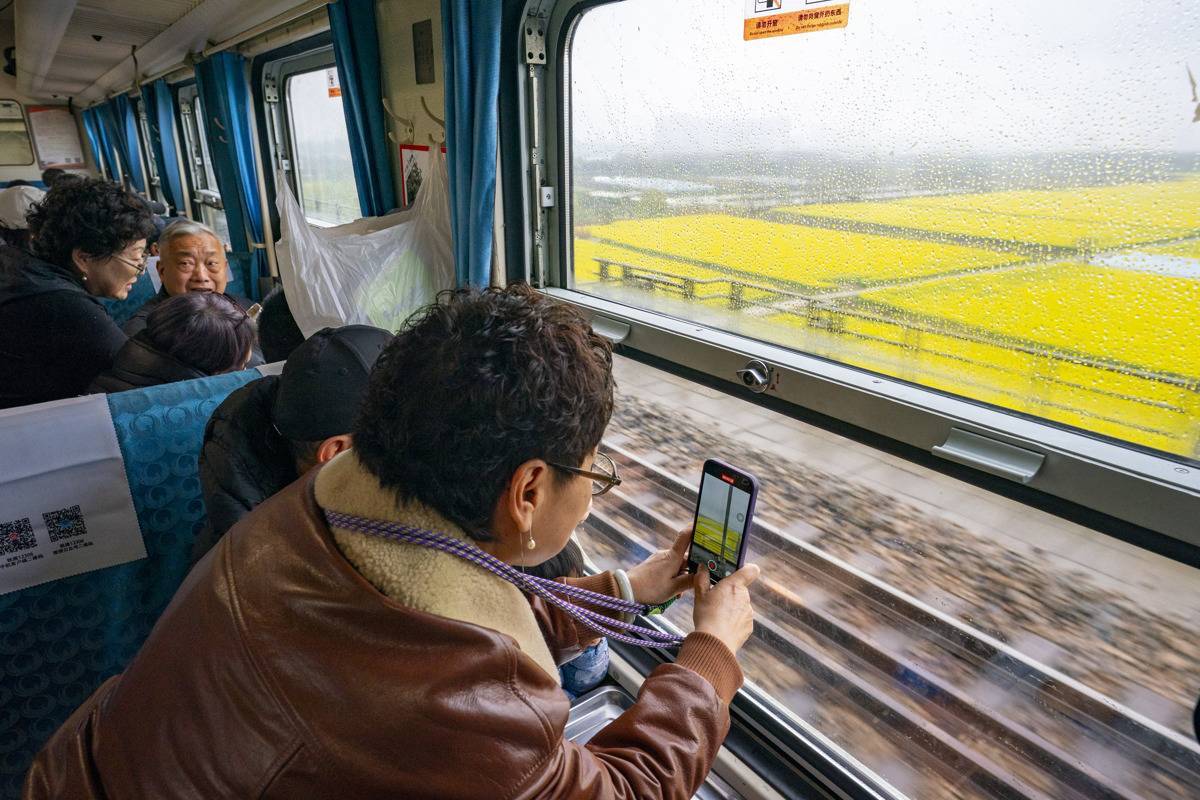 旅客们在车厢里拍摄天兴洲的油菜花海。