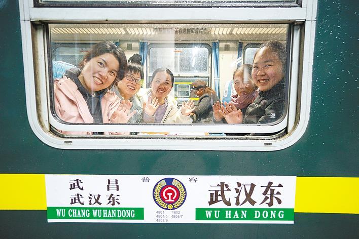 3月16日15时52分,武汉东站始发的4806次“武汉东—武汉东”环线普速列车准点发车,定员732人的车厢搭载旅客869人,抵达汉口站时增至893人,现场人气堪比春运。