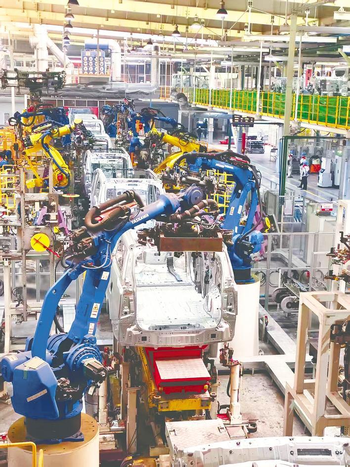 抓取、焊接、涂胶、合并……近300台工业机器人在产线上奏响交响乐;人机协作下,平均每3分钟便有一台新能源MPV下线。3月11日,湖北日报全媒记者走进长城汽车大冶分公司生产车间,一幅热火朝天的景象展现在面前。