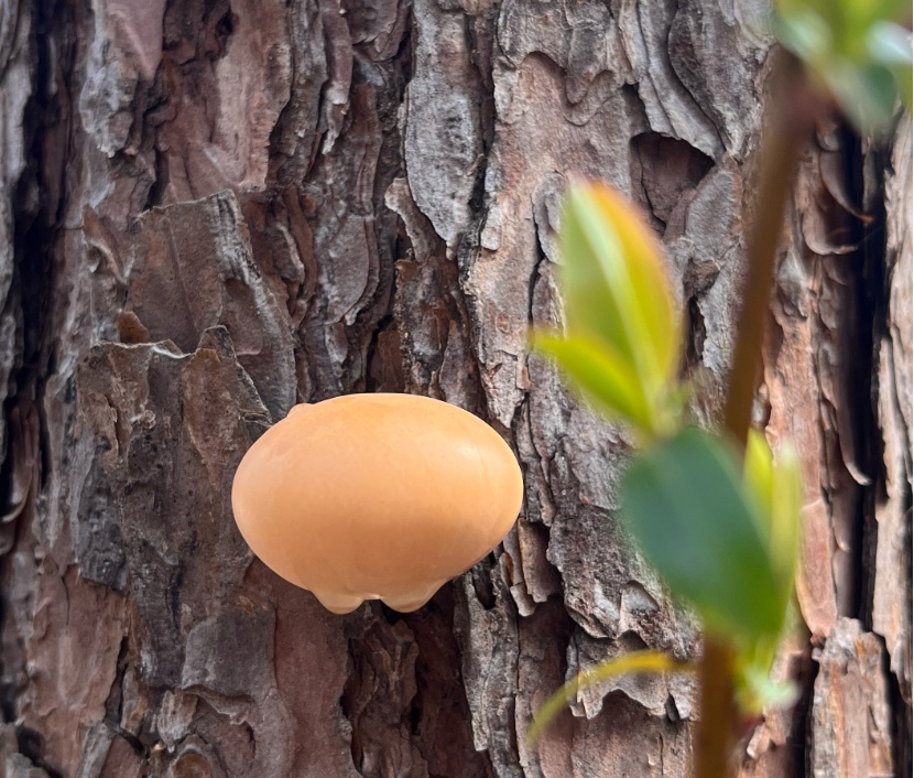 秦岭隐孔菌是隐孔菌属中体型较大的种类,子实体呈蹄形至扁球形,最大可达宽6.5厘米、厚2.5厘米,孔口表面被一层膜状包被完全包裹,仅基部留有圆形小孔,是该属真菌的典型特征。新鲜子实体有明显木质香气。目前该菌仅发现于马尾松枯立木或倒木上,多以单生或散生形式出现。其独特的包被结构是为适应昆虫传孢演化形成,真菌与昆虫互惠共生,成为森林生态系统协同演化的生动体现。