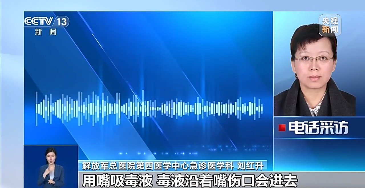 解放军总医院第四医学中心急诊医学科 刘红升:如果你嘴有伤口,用嘴吸毒液,嘴伤口会进去。再有就是说我们挤,一个可能挤不出来,挤了以后会使毒液在组织间隙里面蔓延得更快,不建议。