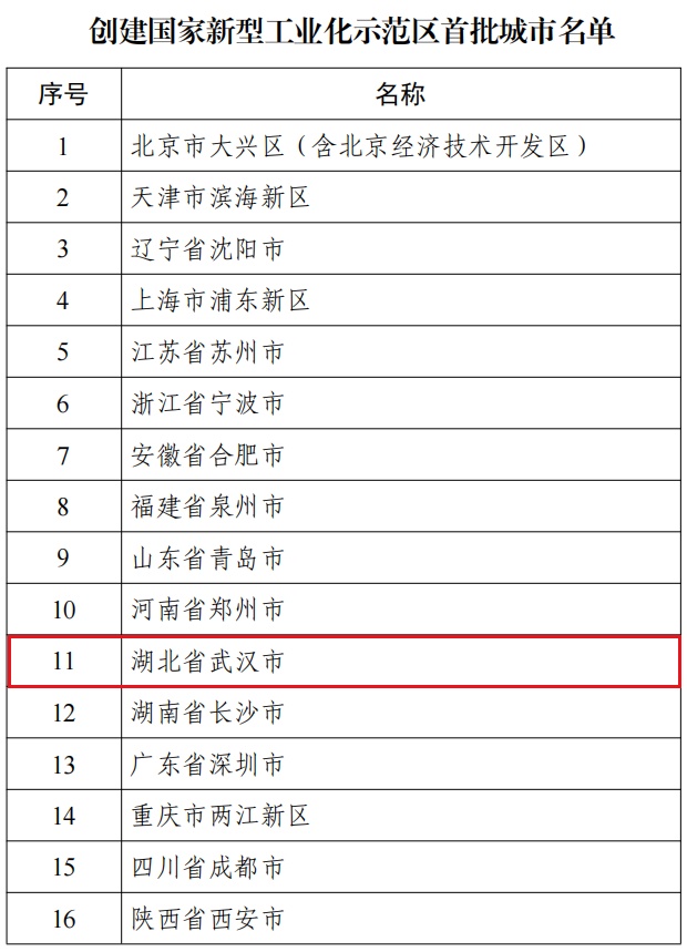 湖北日报讯(通讯员武经宣、记者马文俊)3月16日,工业和信息化部公布全国首批16个创建国家新型工业化示范区城市名单,武汉成功入选。长期以来,武汉在培育壮大先进制造业集群,推动制造业智能化、绿色化、融合化发展方面持续探索,此次入选,将肩负起为全国新型工业化探路先行的重任。