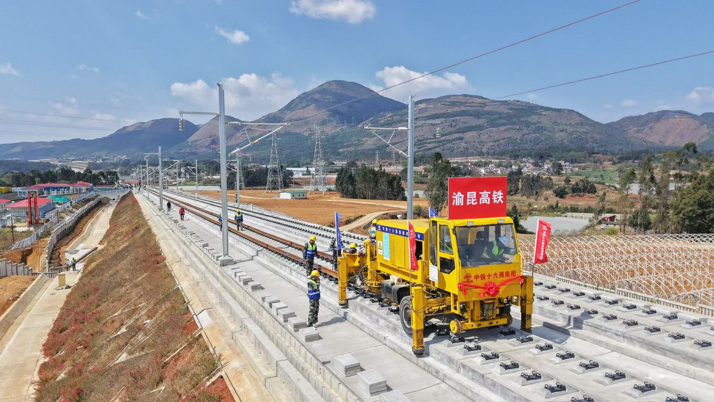 “渝昆高铁集复杂地质、长大隧道群等特点于一体,我们针对性研发应用了长大坡道铺轨、制动与精调成套技术,并配备先进工装设备与智能监测系统,确保铺轨安全和精度。”中铁十六局渝昆高铁铺轨施工技术负责人张延说。