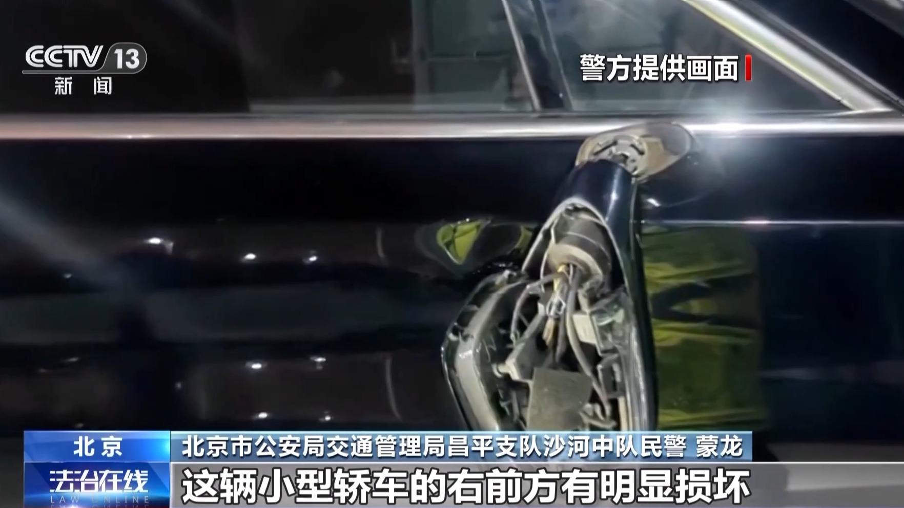 北京市公安局交通管理局昌平支队沙河中队民警 蒙龙:经过勘查,我们发现这辆小型轿车的右前方有明显损坏,与自行车相撞的部位十分一致,车的左前方也有损伤,尤其是车的左前轮已经爆胎了,经过与录像对比,我们发现它的遗留痕迹与道路左侧护栏相撞的痕迹基本吻合。