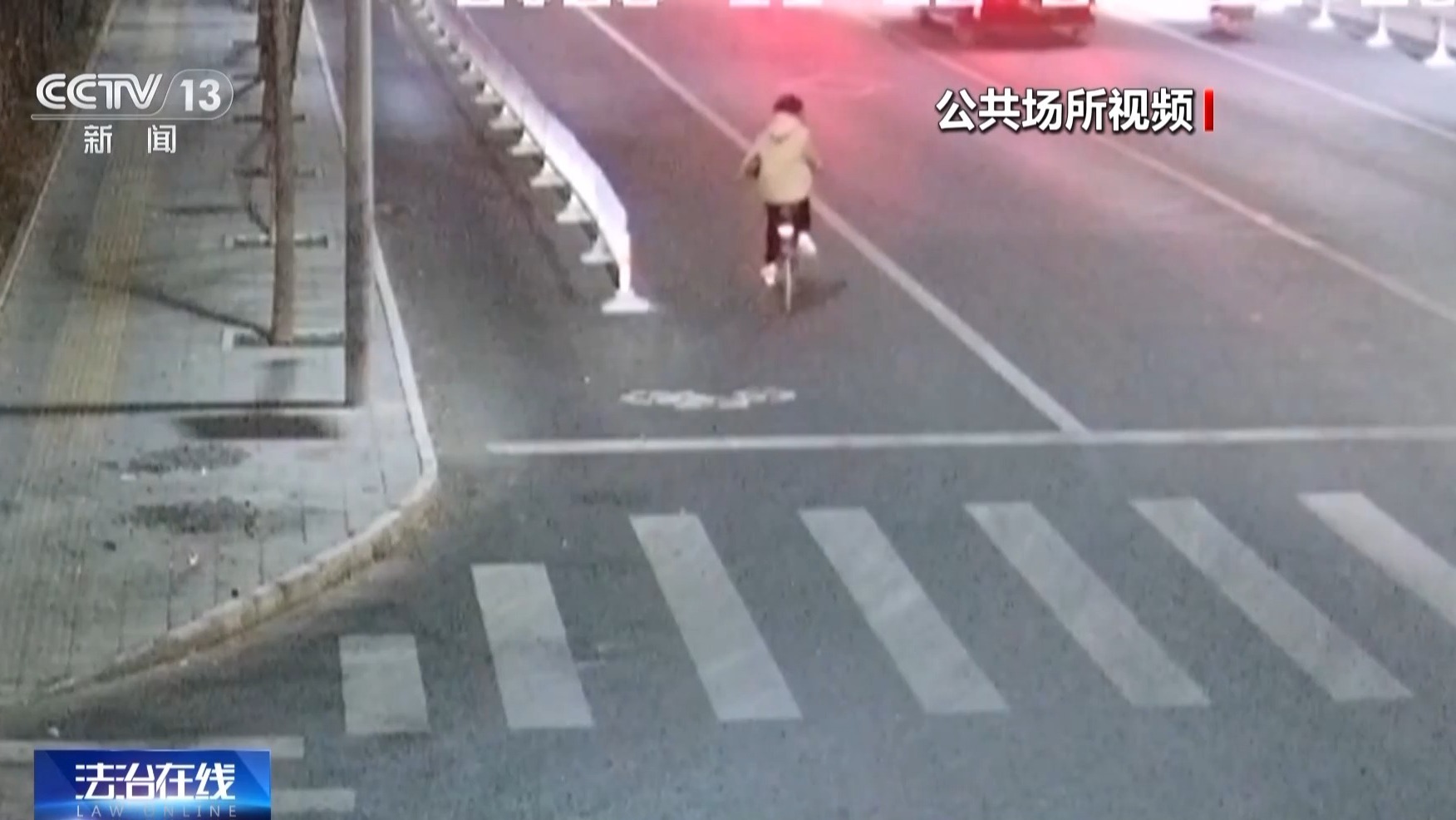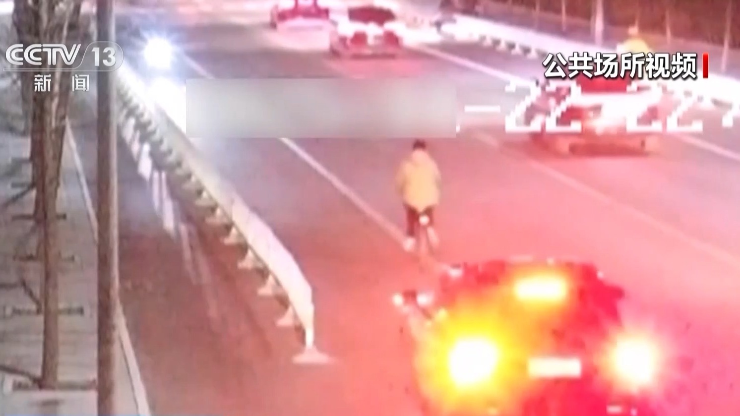 骑车人被撞倒地的同时,所骑的自行车也滑向了中间车道。