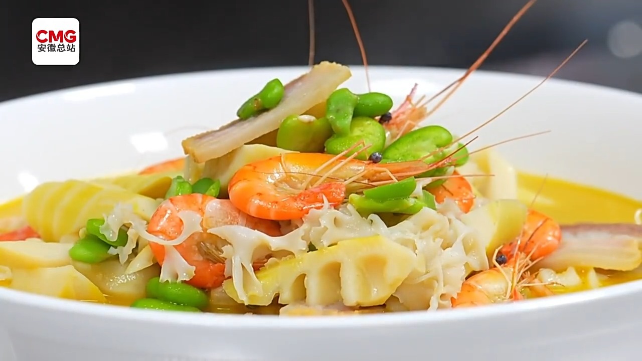 制作前,厨师会以冰糖入水焯烫春笋,这样既能褪去笋中涩味,又能将其天然的清甜鲜香充分激发。随后,新鲜河虾、翠绿蚕豆米、脆嫩绣球菌与安徽咸肉依次登场,再注入文火熬制的鸡汤,汤沸之际下入春笋,慢炖三分钟,让鸡汤的醇厚、春笋的清甜、河虾的鲜嫩与腊肉的咸香在锅中层层交融。全程仅以少许食盐提味,不做多余调味,只为最大限度保留食材本真的风味。