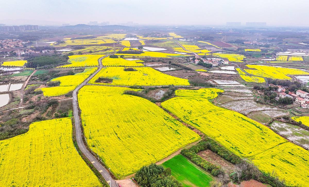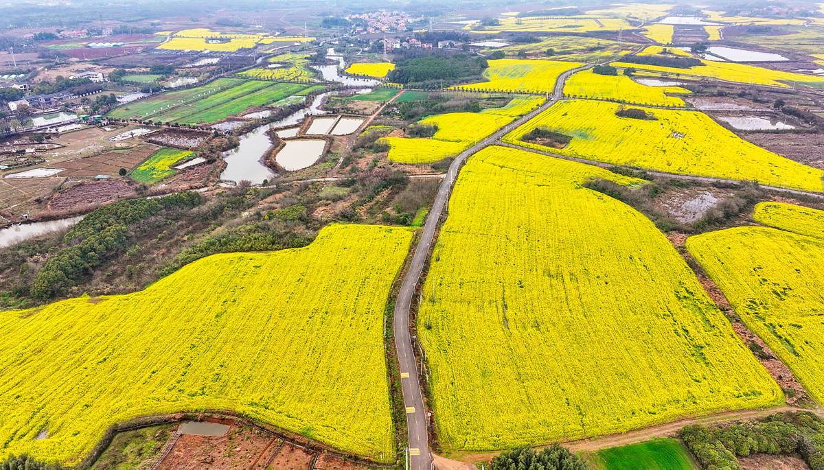3月18日,鸟瞰位于武汉市江夏区五里界街农家畈赏花大道,大道两边是万亩盛开的油菜花海格外美丽。