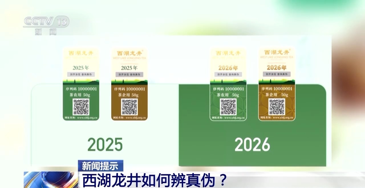 杭州市西湖龙井茶管理协会秘书长 钮杭:字体颜色2026年调整为金色,与标识上的西湖龙井商标保持一致,同时在底纹上增加茶叶的暗纹。从内置上来讲,今年,茶农标的溯源信息也嵌入了所在茶村的茶地矢量信息和农产品质量安全承诺达标合格证的相关信息。