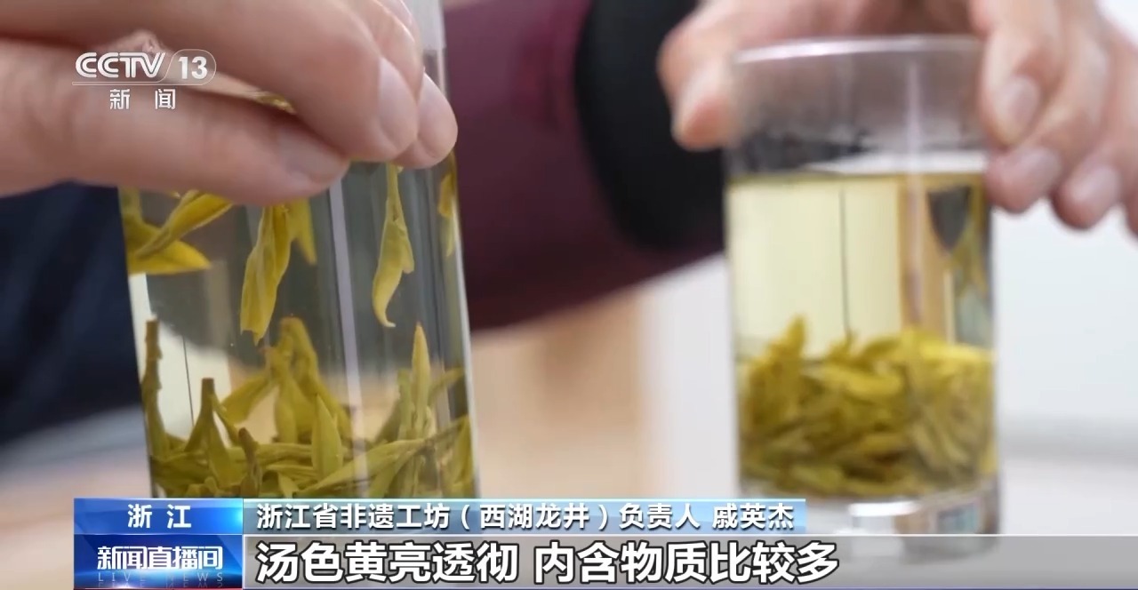 浙江省非遗工坊(西湖龙井)负责人戚英杰介绍,今年西湖龙井狮峰山的头采茶,芽叶舒展肥壮,汤色黄亮透彻,内含物质比较多。去年的茶虽然也是好茶,但两个相比较还是存在差距,茶汤比较暗淡,香气也稍差一些。