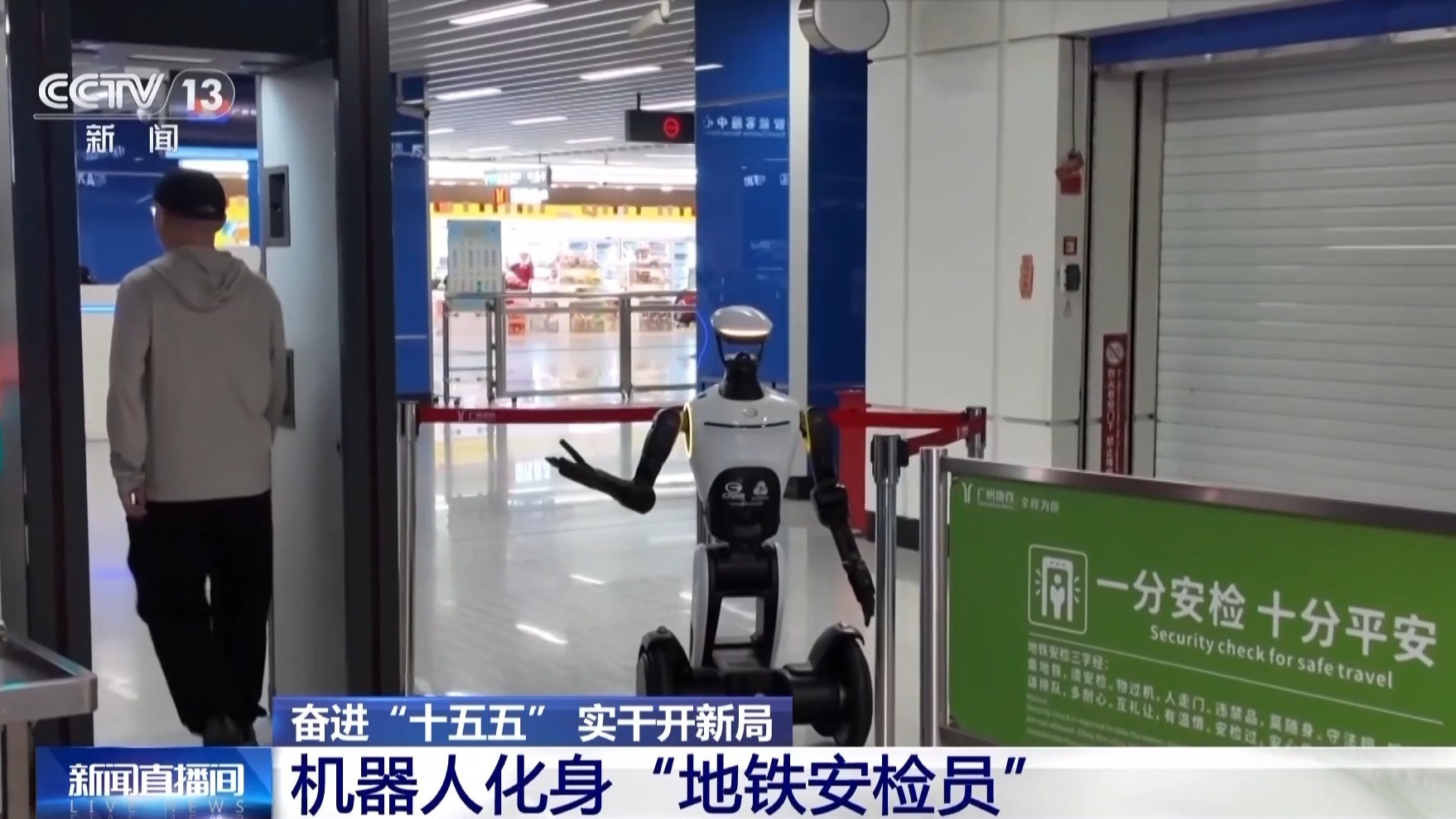 总台记者 秦芊茗:我现在就在广州市一家具身智能机器人实验室,研发人员正在对最新推出的机器人进行功能测试与调整。它就是在地铁站工作的智能安检机器人,它的职责和我们平时乘地铁时遇到的安检员一样,精准识别带包乘客,引导他们进行安检。这款机器人目前已经在广州黄村地铁站落地了。