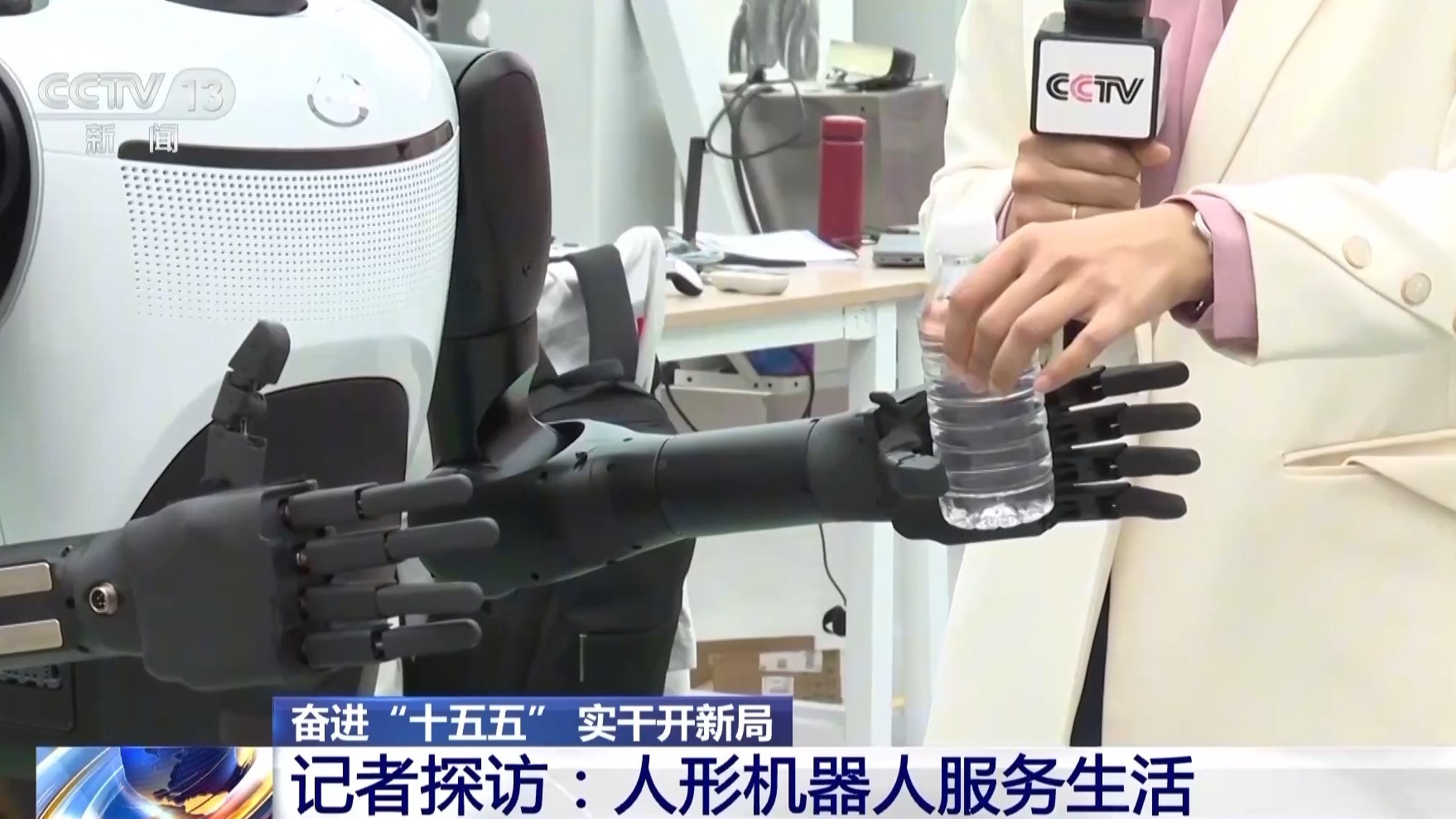它采用仿真灵巧手的设计,可以智能抓取和传递物品。大家都知道坐地铁时,携带的液体物品需要单独过安检,我们可以把水递给它,让它来进行检测。目前,研发人员还在对这双灵巧手进行更多功能开发,比如按钮、拧开关等更精细的操作。