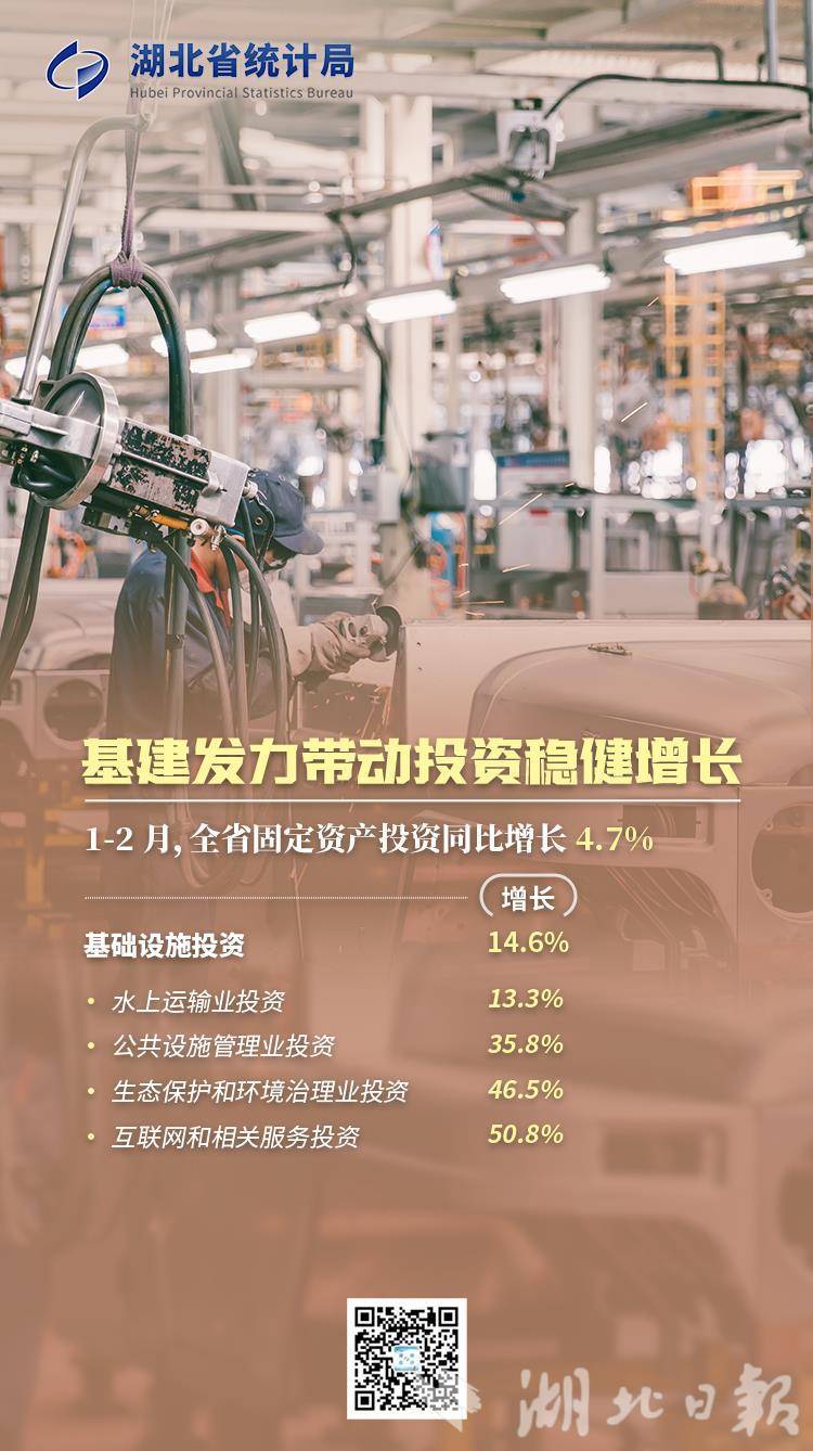 投资结构持续优化释放积极信号。1至2月,全省固定资产投资同比增长4.7%,高于全国2.9个百分点。其中,基础设施投资增长14.6%。互联网及相关服务投资、生态保护和环境治理业投资、公共设施管理业投资均实现30%以上的高速增长,既补齐民生短板,又激活发展后劲。