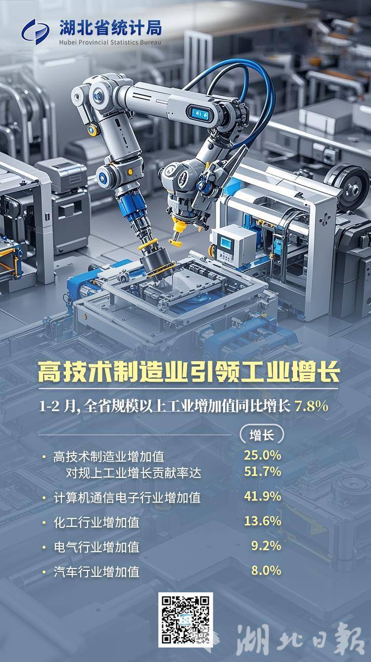 从工业看,新质生产力依然是我省工业经济增长的重要引擎。1至2月,全省规模以上工业增加值同比增长7.8%,高于全国1.5个百分点。高技术制造业增加值增长25%,对规模以上工业增长贡献率达51.7%,成为引领工业增长的主力军。其中,计算机通信电子、化工、电气、汽车行业增加值分别增长41.9%、13.6%、9.2%、8.0%。