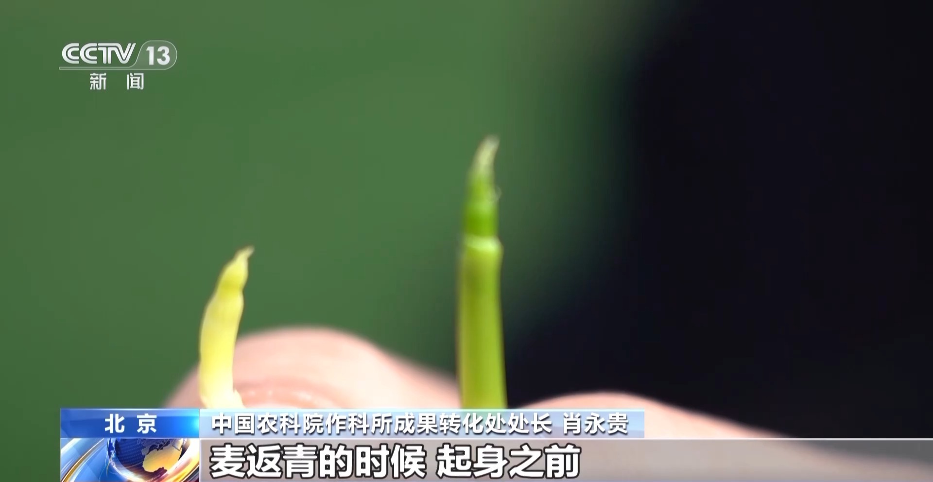 中国农科院作科所成果转化处处长 肖永贵:匍匐的时候就是麦返青的时候,起身之前,它的基部节间已经有了,已经明显能看到麦穗了,这个时候就开始拔节了。