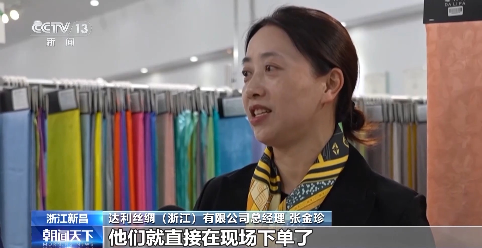 达利丝绸(浙江)有限公司总经理 张金珍:包括从美国、德国过来的客户,有的客户看到我们一些心仪的产品,他们就直接在现场下单了。